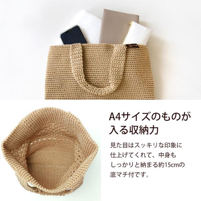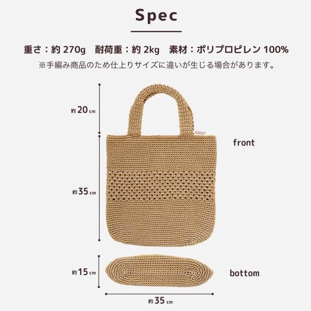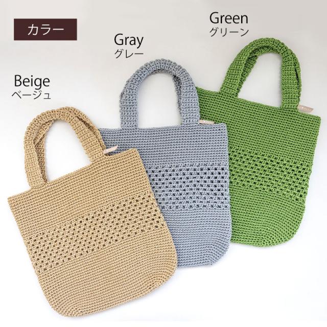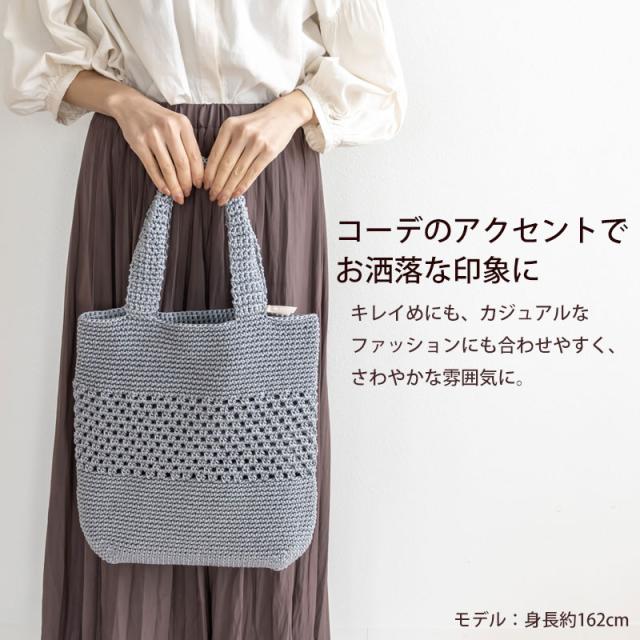 | 商品説明 | 日常で使えるシーンは多く、お買い物用バッグや普段持ち歩くバッグなどとしてもマルチに使えるトートバッグ。 丈夫なポリプロピレンの糸を使って手編みしました。 見た目はすっきりにみえますが、A4サイズのものも収納できるゆとりのある大きさで、マチがあるのでしっかりと中身も納まります。 カラーは着こなしのアクセントになるグリーン、素材感にあったナチュラルなベージュ、大人っぽいグレーの3色展開です。 近所へのお出かけやショッピングなど、シンプルでおしゃれな雰囲気がとても使いやすいバッグに仕上がっています。 涼し気なデザインで夏のレジャーや旅行先で使うのもおすすめです。 アウトドアなどの汚れやすい場所で汚れてしまっても洗濯ネットに入れて洗濯機で丸洗いOK。 何かと汚れても洗えるバッグは少ないものだからこそ洗濯ができるのは嬉しいポイントです。 |