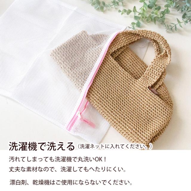 | お取扱いとお洗濯について | ・約2kgまでを目安に入れてください。(重すぎると生地が損傷する恐れがあります。) ・生地の特性上、使用しているうちに伸縮する場合や色移り、色落ちすることがあります。 ・手編み商品の為、仕上がりサイズに違いが生じる場合があります。 ・乾燥機はご使用にならないでください。 ・漂白剤はご使用にならないでください。 ・お洗濯はぬるま湯(30℃以下)で行ってください。 ・ねじり絞りは避け、形を整えて陰干ししてください。 ・洗濯機での丸洗いは洗濯ネットをご使用ください。 ・他の物に色移りする場合がありますので別にしてください。 ・糸を引っぱったり、引っかけたりしないでください。(糸がほどけた場合は、つくろってください。) |