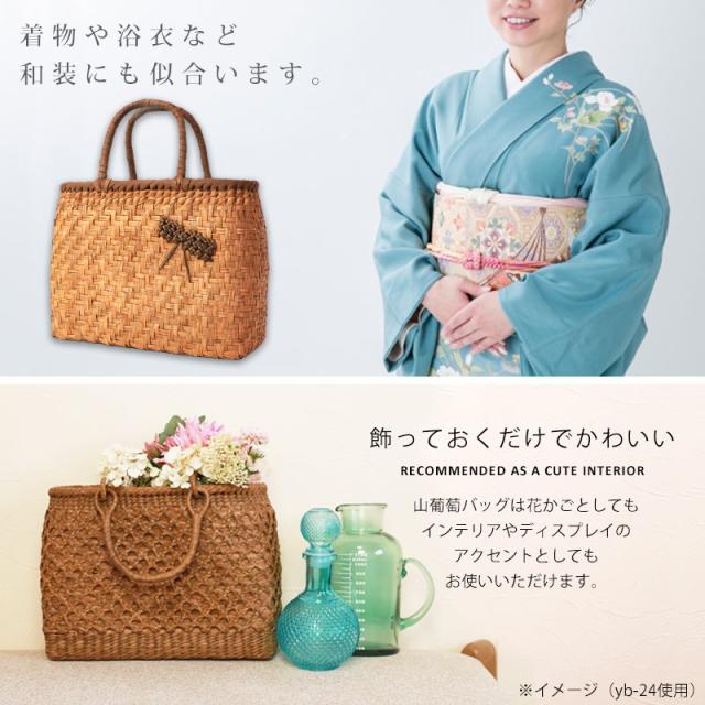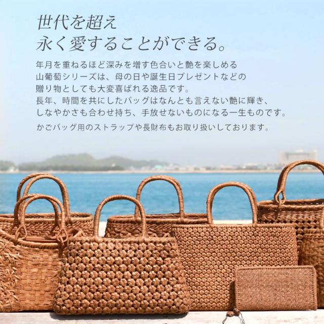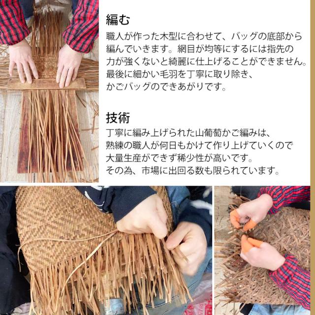 | 商品説明 | 天然山葡萄の蔓(つる)のバッグかごです。山に自生する山葡萄の蔓を贅沢に使用し、熟練の職人さんが手作りで編み上げています。 天然素材の丈夫で美しい一生もののバッグです。 使えば使うほど艶が出て美しく変化していく山葡萄かごバッグは「育てる」バッグです。 必要なものがしっかり収まる程よいサイズ感。自然素材の可愛いシルエットで、マチも十分にあるので普段使いに大活躍のファッションアイテムです。 季節を問わず通年使え、着物にもカジュアルにも似合います。 付属の内布は柿渋染めです。天然素材ならではの温かみのある色合いで、防腐、防虫効果に優れています。柿渋染めは使い込むほどに深みのある色へ変化していきます。 やさしい風合いが山葡萄バックに相性がよろしいです。 お手元に届きましたら、毎日、バッグを手で撫でてあげてください。 山葡萄の皮は油分を吸収する特徴がある為、撫でてあげると手の油を吸収し、ゆっくりとアメ色に変化し光沢が増していきます。 時間とともに自分色に染まるようで、とても愛着が沸きます。変化の時間もお楽しみいただけます。 これを「山葡萄バッグを育てていく」と言いますが、同じバッグでも育て具合で色合いに差が出てくるので世界で一つしかないバッグになります。 <山葡萄バッグができるまで> ・蔓の採取 山葡萄の蔓から取った皮を使い、熟練の職人が丹精込めてひとつひとつ作っています。 人里離れた標高1,000m以上の山奥で昔から寒冷地に自生する植物です。 蔓と言っても太さ10cm以上にもなります。 その蔓を剥ぎ取り乾燥させて、かごバッグの材料となるようサイズを整えていきます。 ・編む 職人が作った木型に合わせて、バッグの底部から編んでいきます。 網目が均等にするには指先の力が強くないと綺麗に仕上げることができません。 最後に細かい毛羽を丁寧に取り除き、かごバッグのできあがりです。 ・技術 丁寧に編み上げられた山葡萄かご編みは、熟練の職人が何日もかけて作り上げていくので大量生産ができず稀少性が高いです。 その為、市場に出回る数も限られています。 ・内布を取り付け ナチュラルでおしゃれな柿渋染めの内布が付いています。天然の柿渋原液を使用し染め上げています。 優しい風合いが山葡萄バックに相性がよろしいです。 内布は縫い付けて固定されていますので、安定した収納ができバッグの中身も安心です。 ・柿渋染めの理由 柿渋には防虫、防カビ、防腐、防臭、消臭などの効果があります。 山葡萄の蔓は正常にご使用、保管していただけば、カビが生えることはありませんが、湿気が多いところで保管すると表面にカビが発生する場合があります。 それを予防目的も兼ねてコストを掛けてでも、山葡萄バッグに柿渋染めの内布を取り付けています。 <山葡萄かごバッグの選び方> 初めて憧れの山葡萄バッグを持つ方は、定番の「網代編み」がとても人気です。 2個目、3個目を購入する方は「六角花編み」や「サイズ違い」をお選びいただく場合が多いです。 山葡萄チャームやお財布もございます。 職人が丁寧に編み上げた籠バッグは世代を超え永く愛することができます。 年月を重ねるほど深みを増す色合いと艶を楽しめる山葡萄シリーズは、母の日や誕生日プレゼントなどの贈り物としても大変喜ばれる逸品です。 長年、時間を共にしたバッグはなんとも言えない艶に輝き、しなやかさも合わせ持ち、手放せないものになる一生ものです。 編み方がおしゃれな山葡萄バッグは花かごとしてもインテリアやディスプレイのアクセントとしてもお使いいただけます。 自然素材をお楽しみください 天然素材を使用し、すべて手編みで手作り品の為、サイズ・重量ともに若干の個体差が生じます。 自然素材特有のささくれ、割れ、色ムラが生じる場合がございます。 ささくれや色ムラ等は、使い込むうちに自然と馴染み、風合いよくなめらかになっていきます。 天然素材を使用している為、予めご理解、ご了承いただき自然の風合いをお楽しみいただければ幸甚です。 |