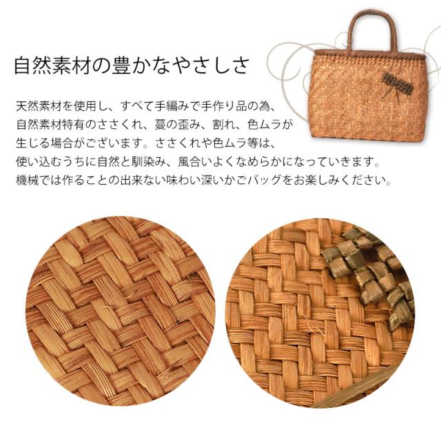 | ご購入に関するご注意 | ・天然素材を使用し、すべて手編みで手作り品の為、サイズ・重量ともに若干の個体差が生じます。 また、自然素材特有のささくれ、蔓の歪み、割れ、色ムラが生じる場合がございます。 ささくれや色ムラ等は、使い込むうちに自然と馴染み、風合いよくなめらかになっていきます。 ・内布もまた天然素材での染めのため、多少色味に違いが生じる場合がございます。 天然素材を使用している為、予めご理解、ご了承いただき自然の風合いをお楽しみいただければ幸甚です。 ・モニター・ディスプレイによっても写り方が変ります。 予めご了承くださいませ。 |