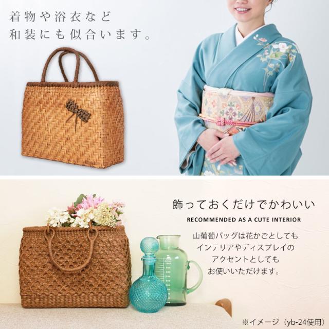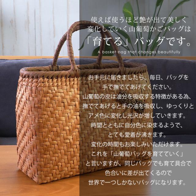 | 商品説明 | 天然山葡萄の蔓(つる)のバッグかごです。山に自生する山葡萄の蔓を贅沢に使用し、熟練の職人さんが手作りで編み上げています。 天然素材の丈夫で美しい一生もののバッグです。 使えば使うほど艶が出て美しく変化していく山葡萄かごバッグは「育てる」バッグです。 必要なものがしっかり収まる程よいサイズ感。自然素材の可愛いシルエットで、マチも十分にあるので普段使いに大活躍のファッションアイテムです。 季節を問わず通年使え、着物にもカジュアルにも似合います。 付属の内布は柿渋染めです。天然素材ならではの温かみのある色合いで、防腐、防虫効果に優れています。柿渋染めは使い込むほどに深みのある色へ変化していきます。 やさしい風合いが山葡萄バックに相性がよろしいです。 お手元に届きましたら、毎日、バッグを手で撫でてあげてください。 山葡萄の皮は油分を吸収する特徴がある為、撫でてあげると手の油を吸収し、ゆっくりとアメ色に変化し光沢が増していきます。 時間とともに自分色に染まるようで、とても愛着が沸きます。変化の時間もお楽しみいただけます。 これを「山葡萄バッグを育てていく」と言いますが、同じバッグでも育て具合で色合いに差が出てくるので世界で一つしかないバッグになります。 <山葡萄バッグができるまで> ・蔓の採取 山葡萄の蔓から取った皮を使い、熟練の職人が丹精込めてひとつひとつ作っています。 人里離れた標高1,000m以上の山奥で昔から寒冷地に自生する植物です。 蔓と言っても太さ10cm以上にもなります。 その蔓を剥ぎ取り乾燥させて、かごバッグの材料となるようサイズを整えていきます。 ・編む 職人が作った木型に合わせて、バッグの底部から編んでいきます。 網目が均等にするには指先の力が強くないと綺麗に仕上げることができません。 最後に細かい毛羽を丁寧に取り除き、かごバッグのできあがりです。 ・技術 丁寧に編み上げられた山葡萄かご編みは、熟練の職人が何日もかけて作り上げていくので大量生産ができず稀少性が高いです。 その為、市場に出回る数も限られています。 ・内布を取り付け ナチュラルでおしゃれな柿渋染めの内布が付いています。天然の柿渋原液を使用し染め上げています。 優しい風合いが山葡萄バックに相性がよろしいです。 内布は縫い付けて固定されていますので、安定した収納ができバッグの中身も安心です。 ・柿渋染めの理由 柿渋には防虫、防カビ、防腐、防臭、消臭などの効果があります。 山葡萄の蔓は正常にご使用、保管していただけば、カビが生えることはありませんが、湿気が多いところで保管すると表面にカビが発生する場合があります。 それを予防目的も兼ねてコストを掛けてでも、山葡萄バッグに柿渋染めの内布を取り付けています。 <山葡萄かごバッグの選び方> 初めて憧れの山葡萄バッグを持つ方は、定番の「網代編み」がとても人気です。 2個目、3個目を購入する方は「六角花編み」や「サイズ違い」をお選びいただく場合が多いです。 山葡萄チャームやお財布もございます。 職人が丁寧に編み上げた籠バッグは世代を超え永く愛することができます。 年月を重ねるほど深みを増す色合いと艶を楽しめる山葡萄シリーズは、母の日や誕生日プレゼントなどの贈り物としても大変喜ばれる逸品です。 長年、時間を共にしたバッグはなんとも言えない艶に輝き、しなやかさも合わせ持ち、手放せないものになる一生ものです。 編み方がおしゃれな山葡萄バッグは花かごとしてもインテリアやディスプレイのアクセントとしてもお使いいただけます。 自然素材をお楽しみください 天然素材を使用し、すべて手編みで手作り品の為、サイズ・重量ともに若干の個体差が生じます。 自然素材特有のささくれ、割れ、色ムラが生じる場合がございます。 ささくれや色ムラ等は、使い込むうちに自然と馴染み、風合いよくなめらかになっていきます。 天然素材を使用している為、予めご理解、ご了承いただき自然の風合いをお楽しみいただければ幸甚です。 |