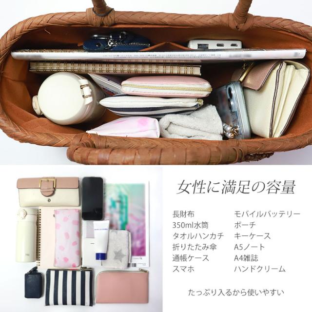 必要なものがしっかり収まる程よいサイズ感。自然素材の可愛いシルエットで、マチも十分にあるので普段使いに大活躍のファッションアイテムです。