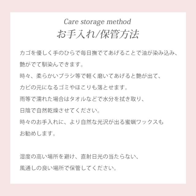| お手入れ方法 | カゴを優しく手のひらで毎日撫でてあげることで油が染み込み、艶がでて馴染んできます。 時々、柔らかいブラシ等で軽く磨いてあげると艶が出て、カビの元となるゴミやほこりも落とせます。 雨等で濡れた場合はタオルなどで水分を拭き取り、日陰で自然乾燥させてください。 時々のお手入れに、より自然な光沢が出る蜜蝋ワックスもお勧めします。(別売品) |