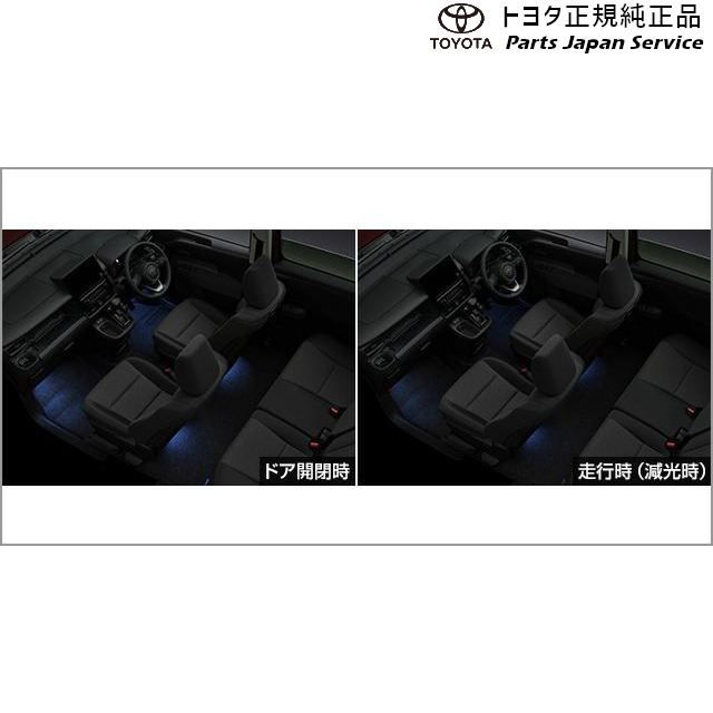 ドアオープン時に間接照明でブルーの光が足元を照らし、ドアクローズ後は一定の時間経過後に徐々に消灯します。走行中は減光点灯し、スイッチのON/OFF操作で点灯・消灯が可能です。[設定]