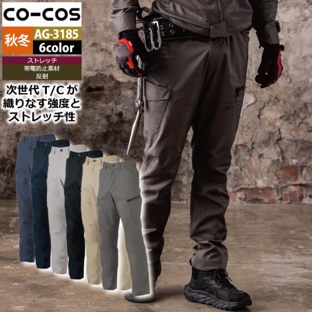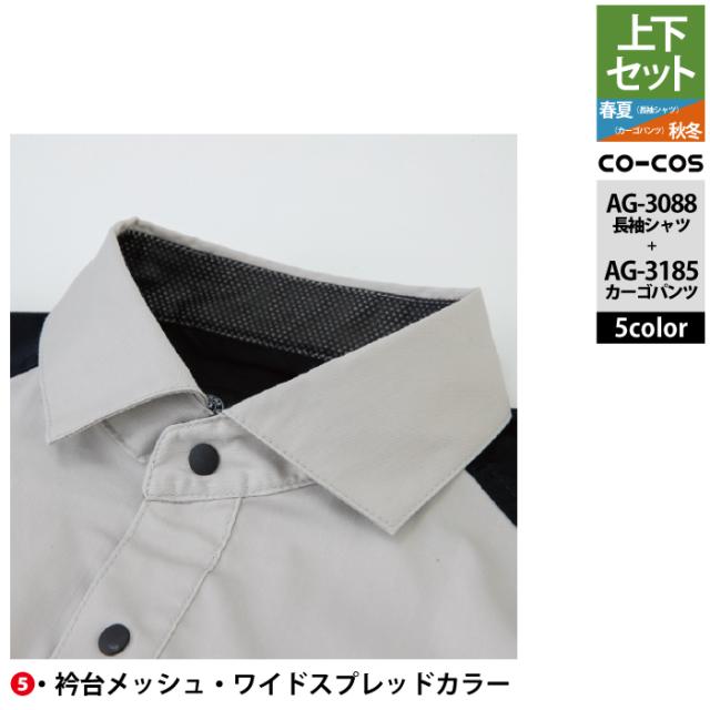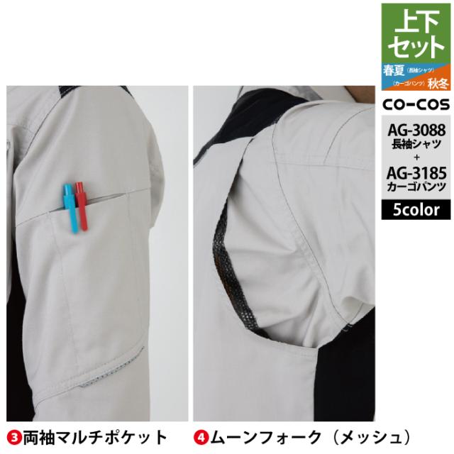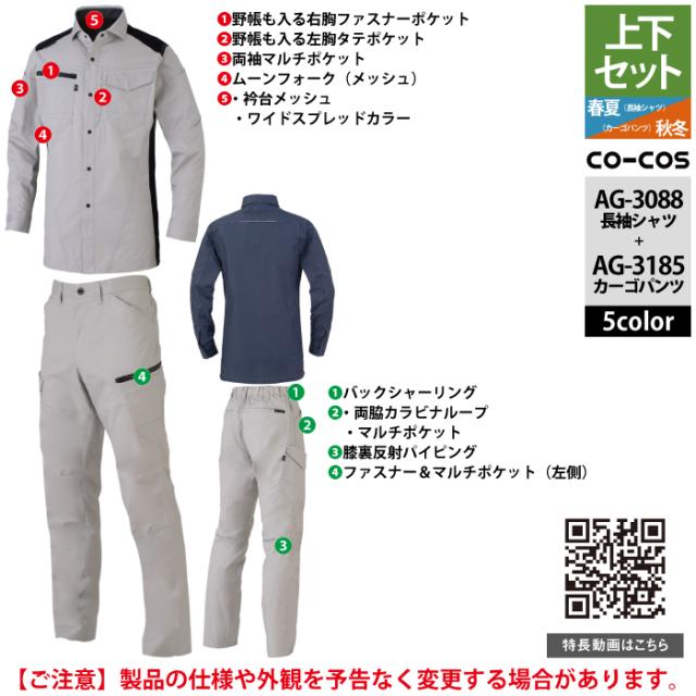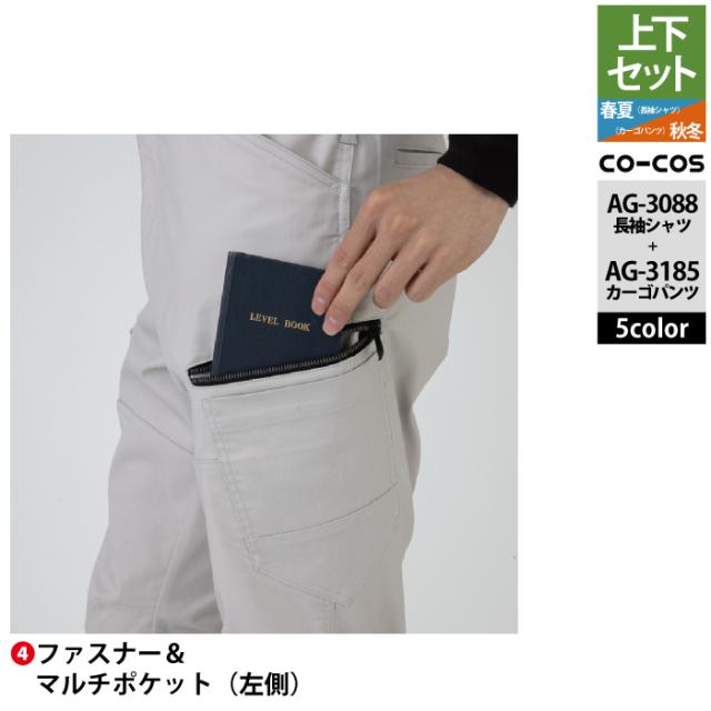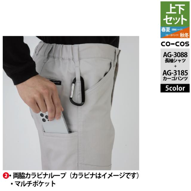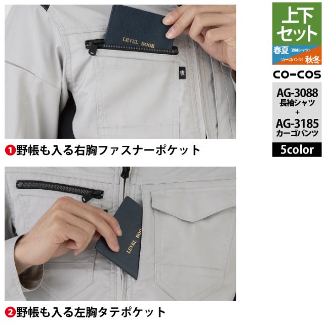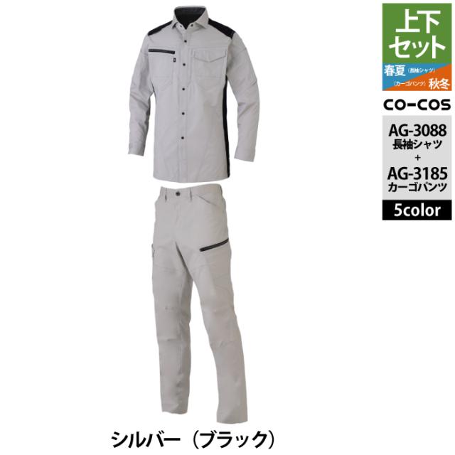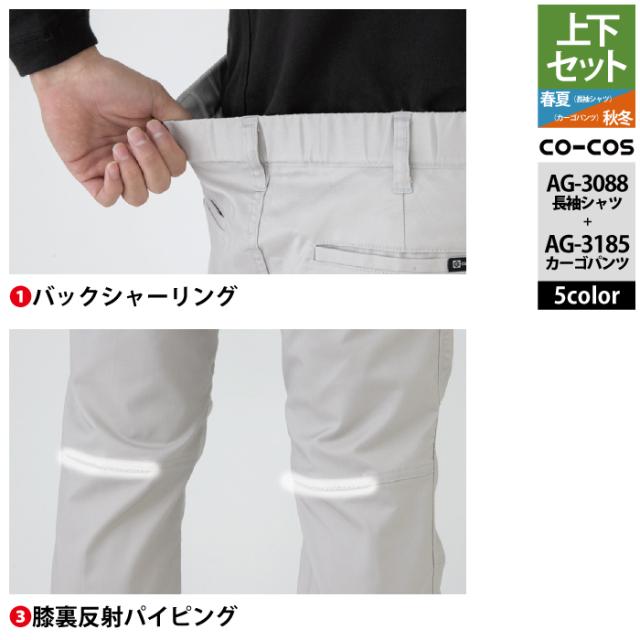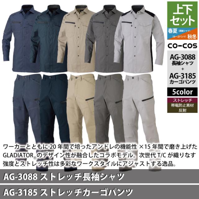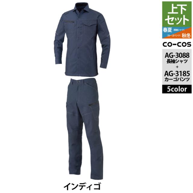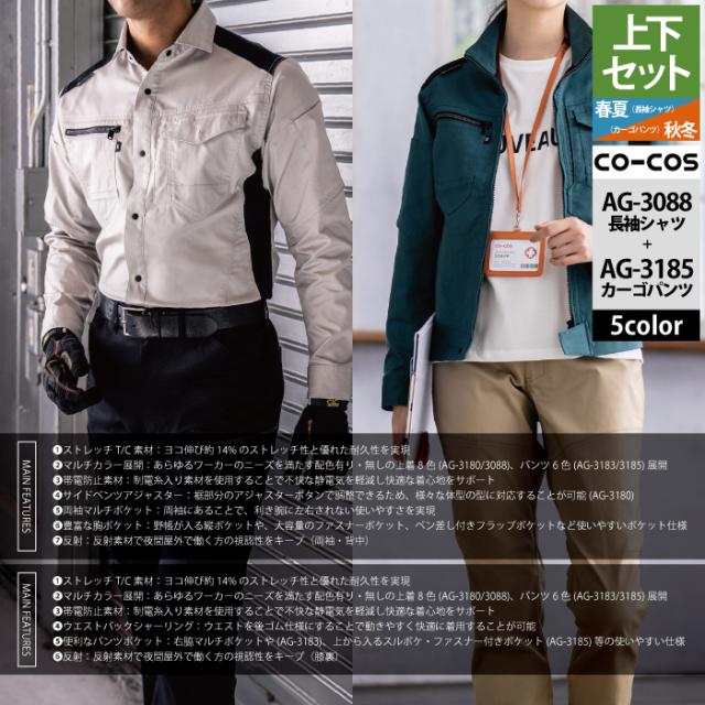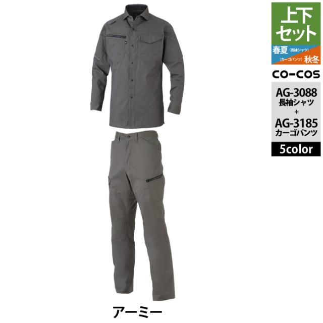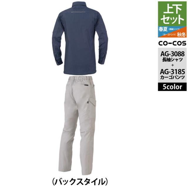 コーコス 作業服 上下セット AG-3088 ストレッチ長袖シャツM-3L と AG-3185 ストレッチカーゴパンツ SS-3L 作業着 作業ズボン 秋冬用