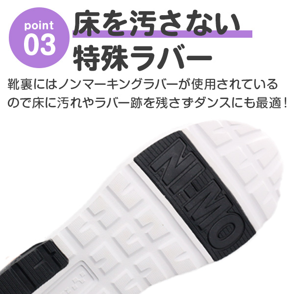 靴裏にはノンマーキングラバーを使用しているので、床を汚したり跡が残ったりしません。ダンスも思いっきり楽しめます。