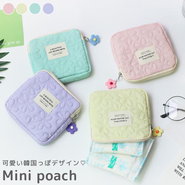ポーチ 小物入れ 小さめ ミニ 薄い レディース コンパクト キルティング 花柄 使いやすい 化粧ポーチ 薬入れ サニタリーポーチ ファスナー お花 チャーム ロゴ リング付き リップ コスメ ナプキン イヤホン 韓国 プレゼント 持ち運び