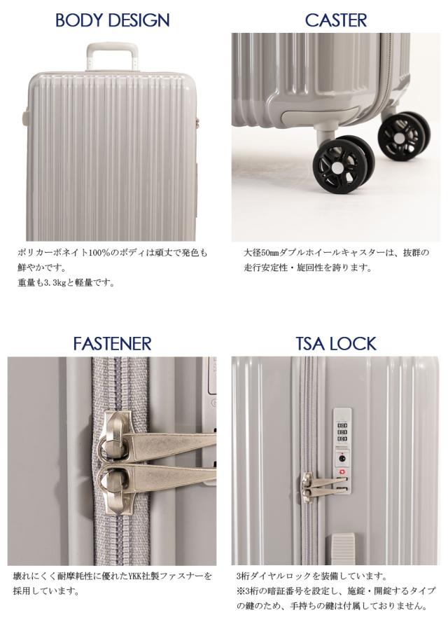 軽量フレームハードキャリー「マジカルイス」にジッパータイプが登場! 設計等妥協せず行いハードキャリーながら重量3.3kgを実現。ボディもポリカーボネイト100%素材を使用し、軽量でありながら耐久性も高いです。 ファスナーは耐摩耗性に優れ壊れにくいYKK社製ファスナーを採用しています。