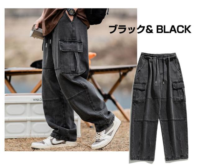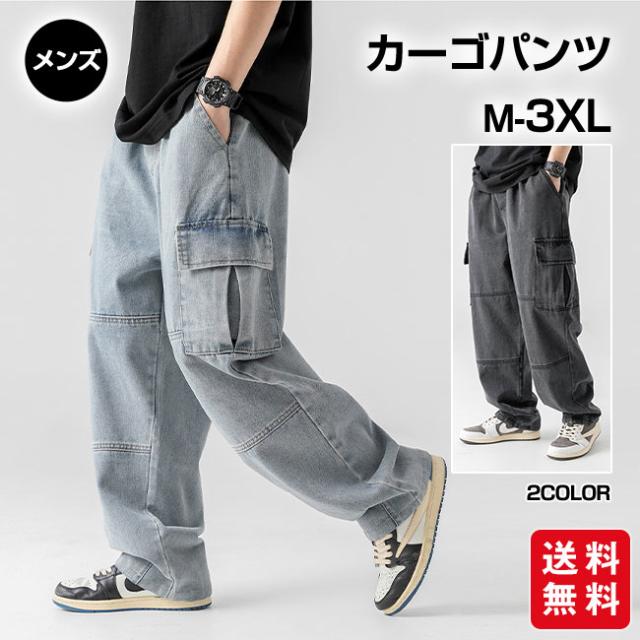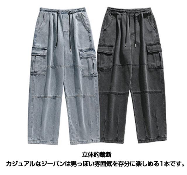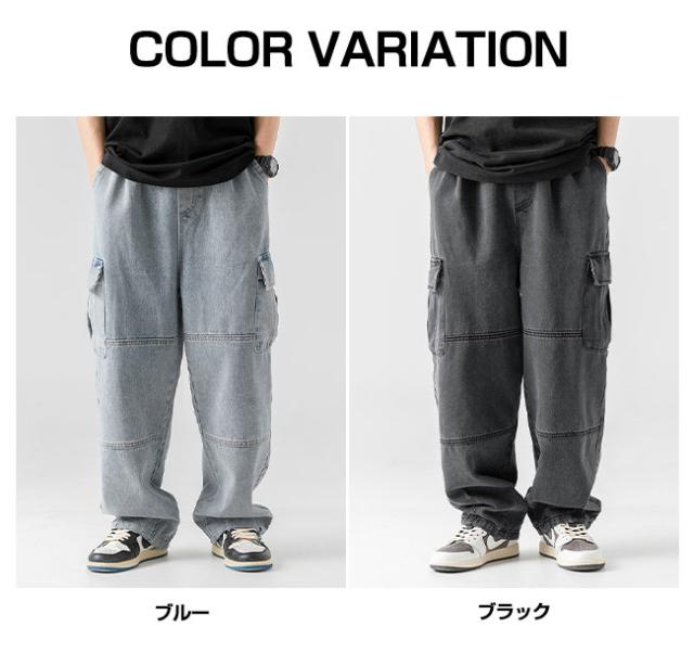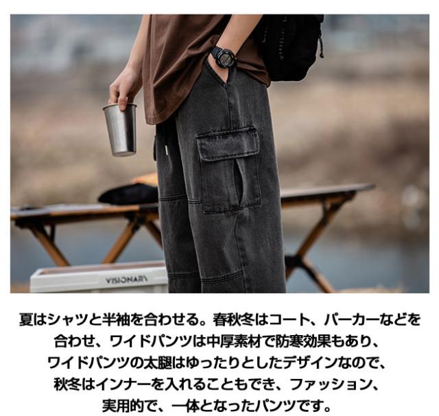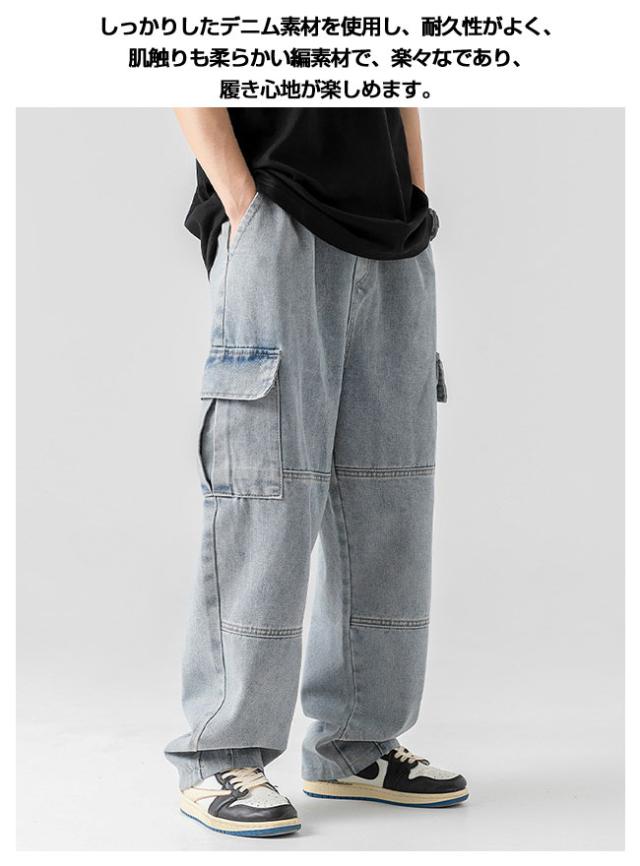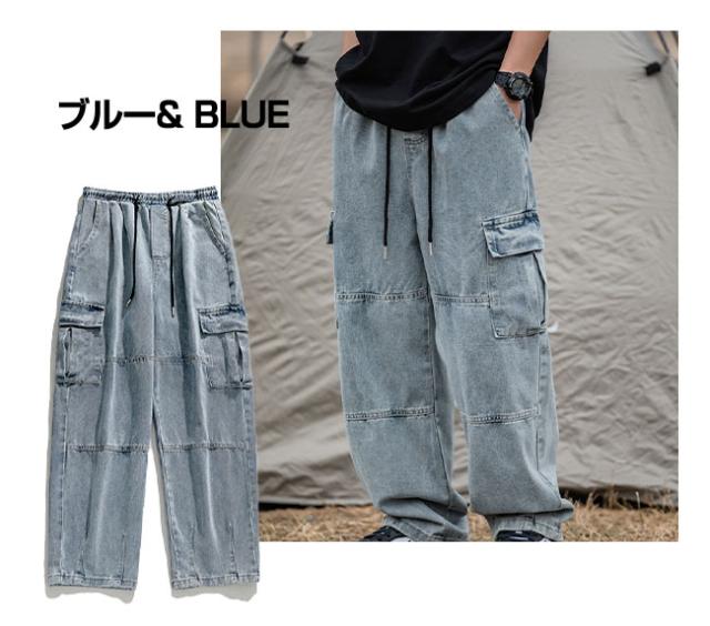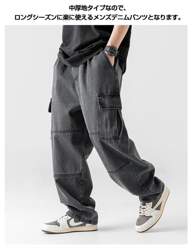 秋新作 カーゴパンツ メンズ デニム ワイドパンツ ウエストゴム ジーンズ サルエル ビッグシルエット ロング カジュアル カッコイイ
