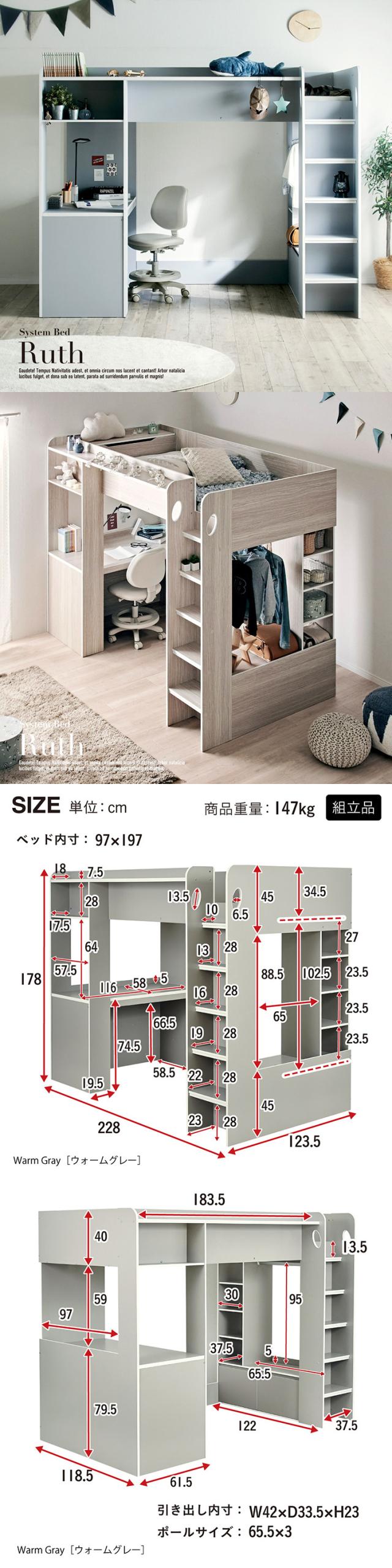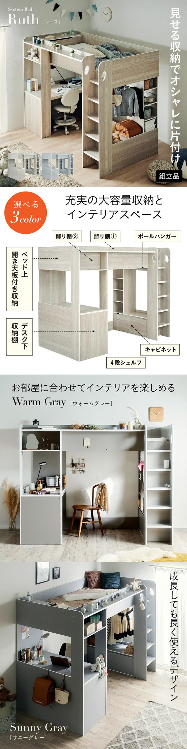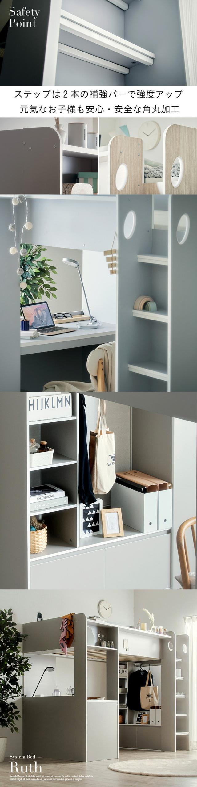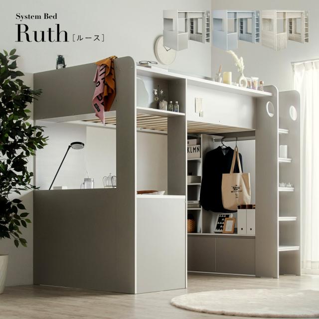 システムベッド ハイタイプ ロフトベッド シングルサイズ デスク付き Ruth(ルース) 3色対応 システムデスク すのこベット シングルベッド おしゃれ 学習机 勉強机 木製 キャビネット 4段 シェルフ 子供 大人 子供部屋