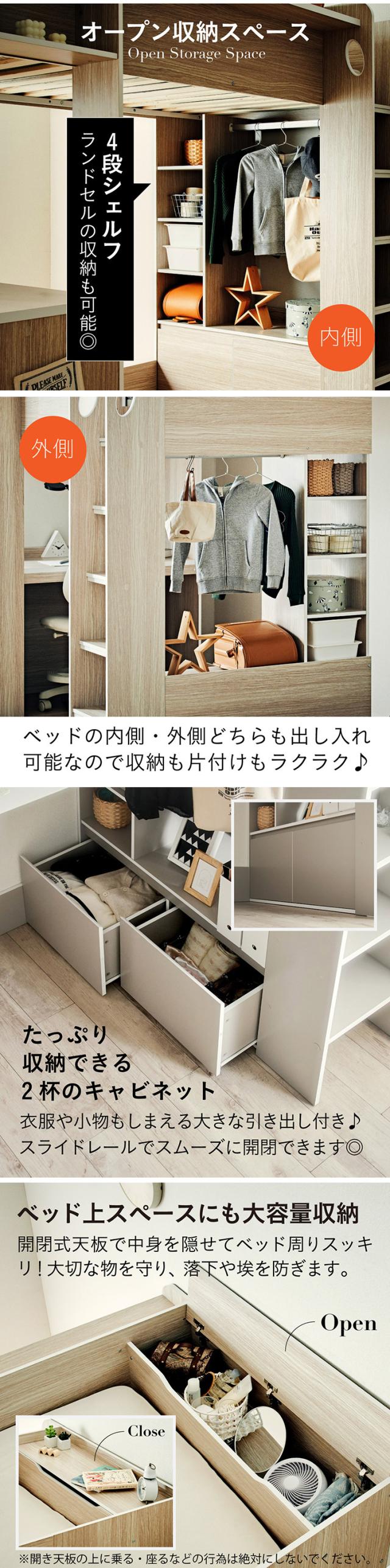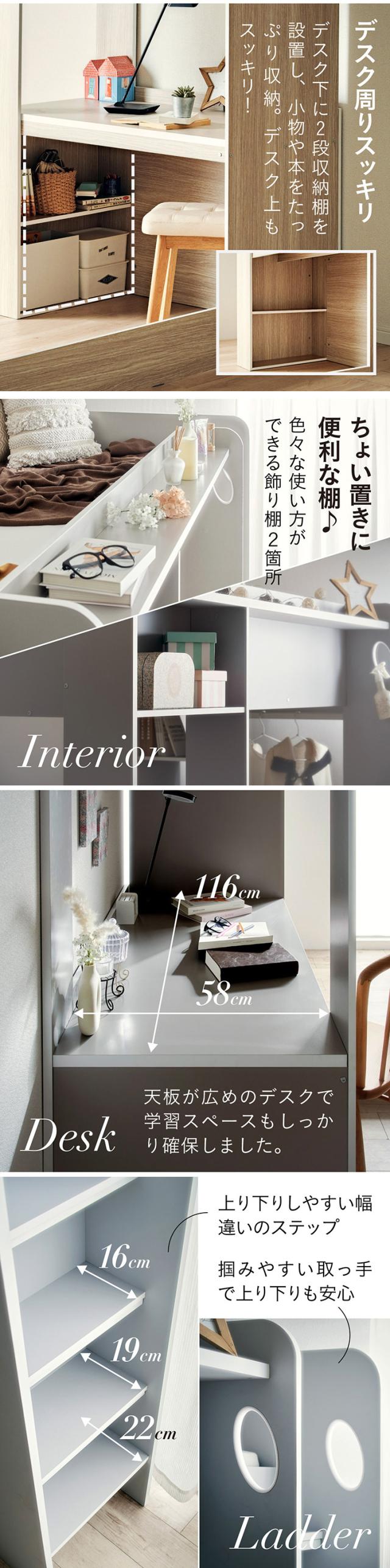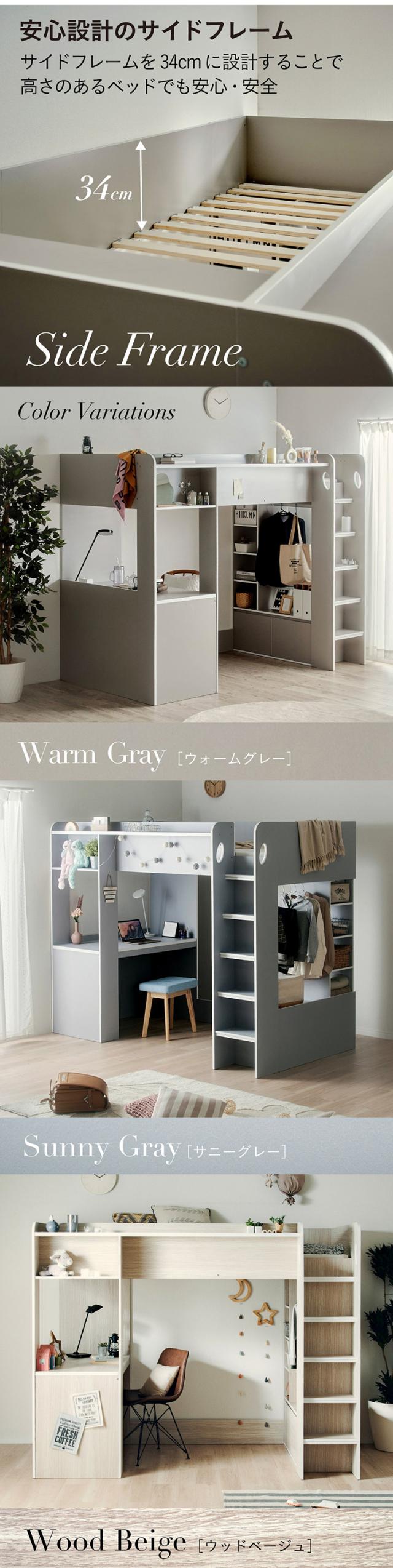 システムベッド ハイタイプ ロフトベッド シングルサイズ デスク付き Ruth(ルース) 3色対応 システムデスク すのこベット シングルベッド おしゃれ 学習机 勉強机 木製 キャビネット 4段 シェルフ 子供 大人 子供部屋