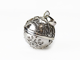 JAWANタイプは、真鍮製の音を奏でるボールを球状の銀のボールで包み、その表面に、さらに銀の粒と銀を細い糸状にしたもので装飾されたガムランボールです。