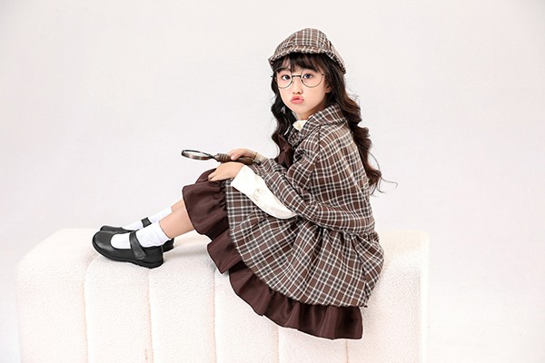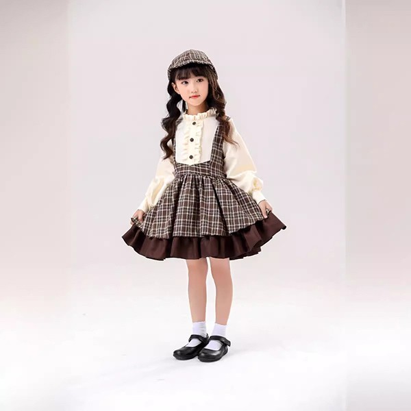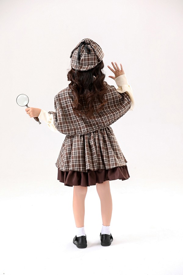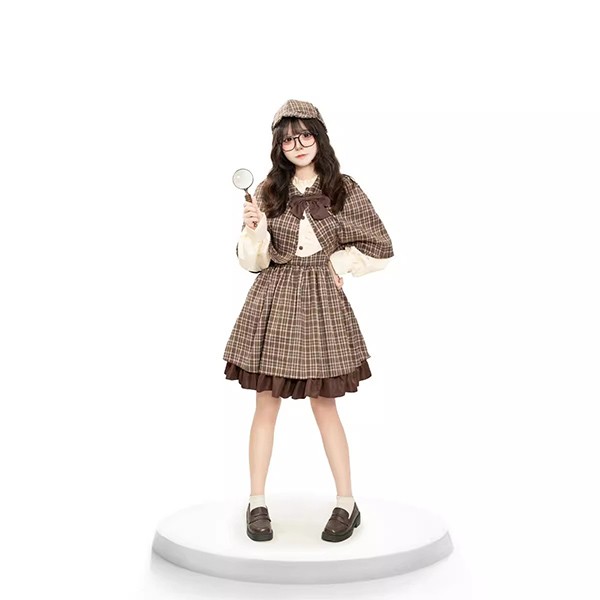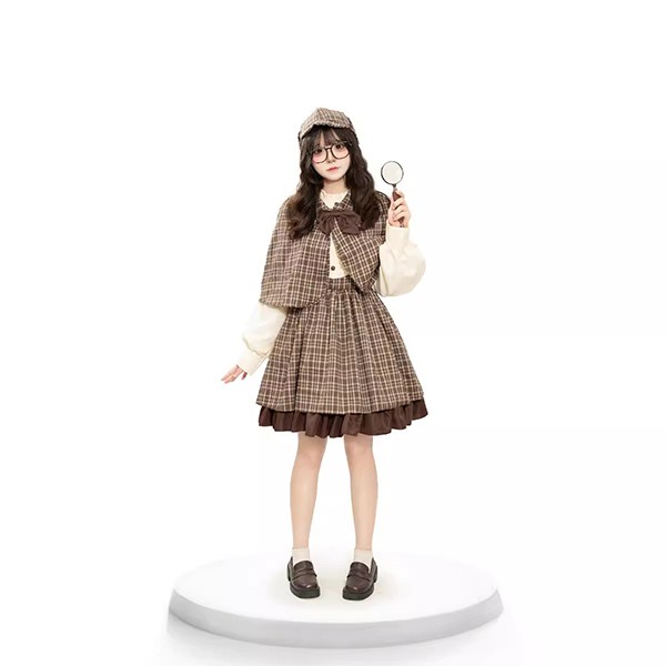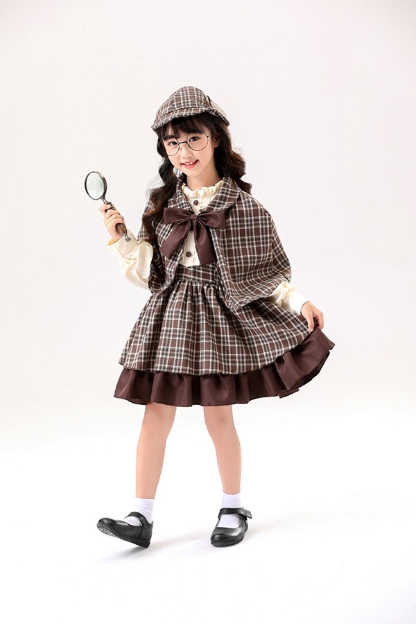 ワンピース lolita 親子ロリータ服 レディース 4点セット コスプレ服 子供 女の子 探偵 学院風 ケープ付き リボン 帽子 110-130 S M L ブラウン aa011m5m5m6