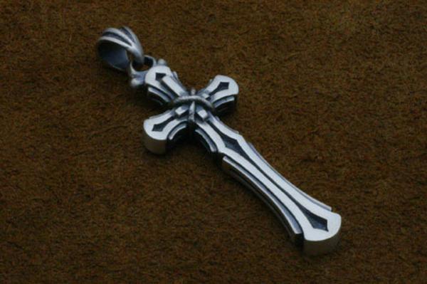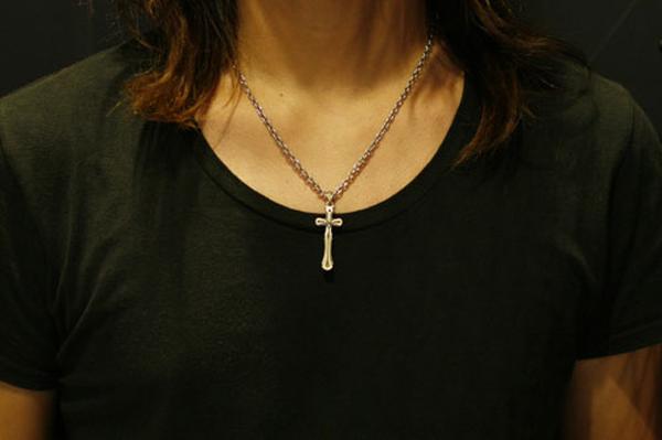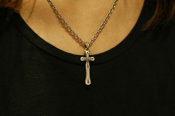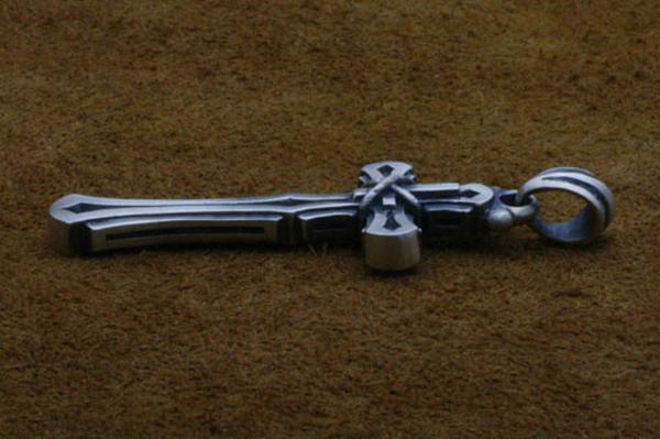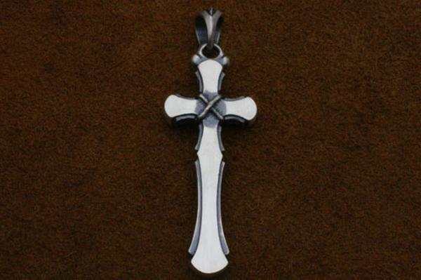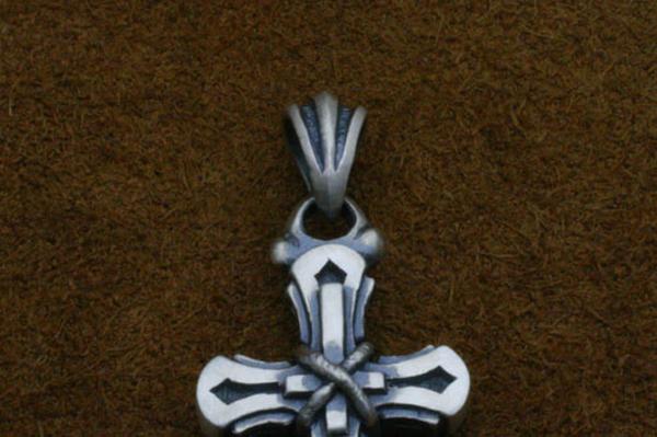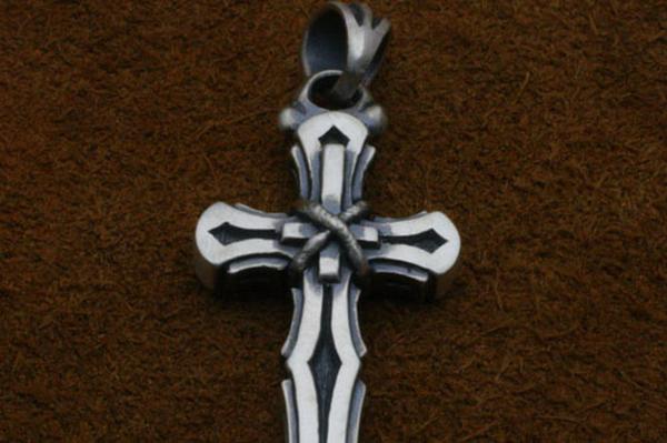 小振りながらも重厚感のあるクロスのペンダント。フラットなクロスに小さな逆十字を縄で括り付け、一見解らないという点で「裏切り」を表現。縄の質感やクロスの縦横の比率にも作者のこだわりが感じられる。適度な厚みを持たせ、着けた時の満足感は十分。