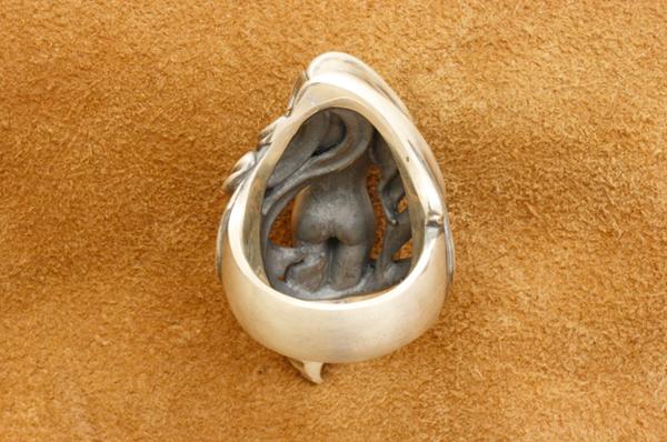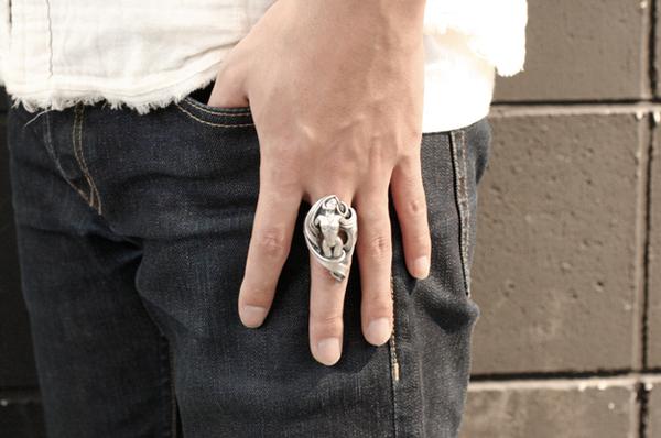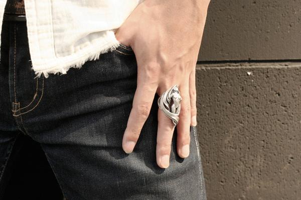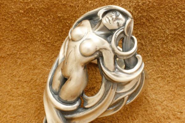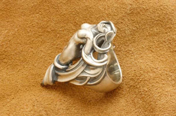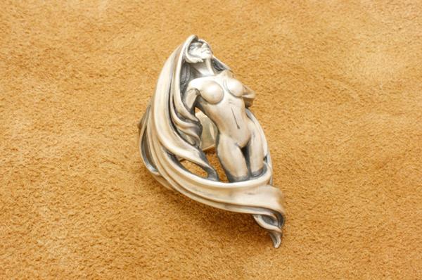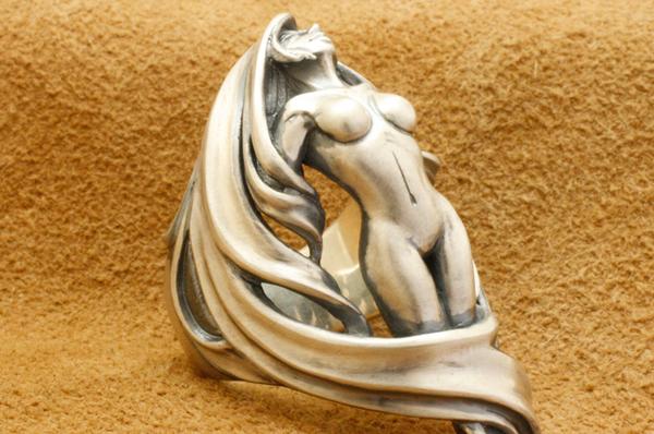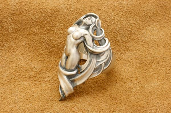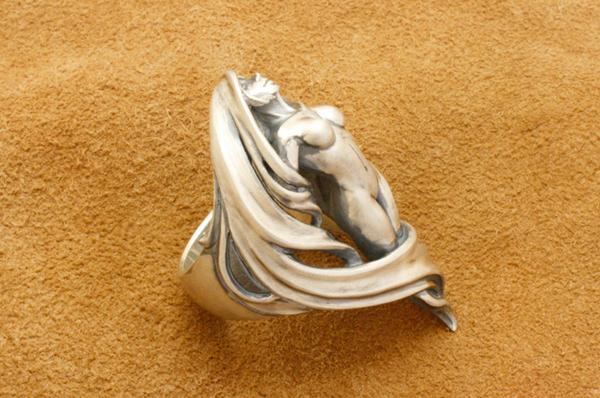 「存在自体が崇高とされるのは美しいものの特権である」という考えのもと、美しさにこだわって制作したリング。リングの上下の頂点をずらすことで指に対してやや斜めに沿うアシンメトリーな造形にしています。髪は角度をつけて透かしにすることで見る角度によって見え方が変わり、女性像は全身を造形してありながら横から見た時には収まりの良いアウトラインになっています。またリング内側はオーバル型に抜いてあり、正面からの見た造形の流れに沿って体と髪が造形されています。