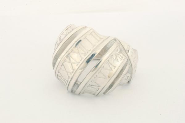 曲線的な逆甲丸の表面と直線的なローマ数字でコントラストをきかせました。