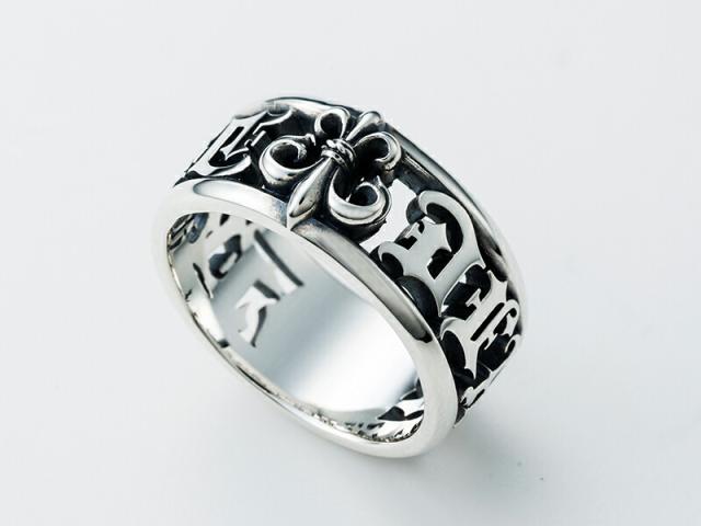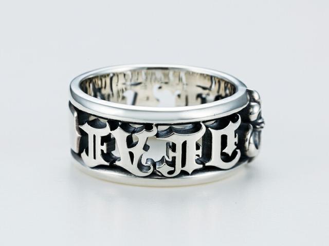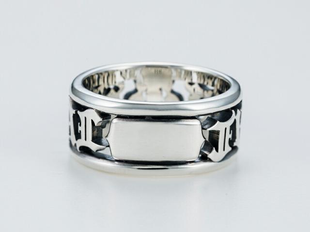 反転したゴシックロゴを深く透かし彫りに仕上げ、向きを気にせず気軽に着け易いリングとなっています。