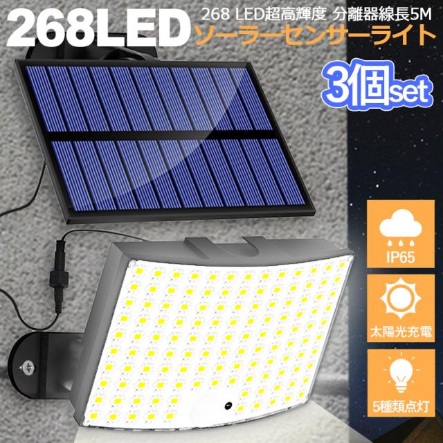 センサーソーラーライト 3個セット ソーラーライト センサーライト 268LED 分離型 防犯 屋外 ソーラーパネル ソーラー セキュリティ 壁付け 人感センサー 防犯ライト ガーデンライト リモコン付き アウトドア モーションセンサー 暗闇センサー セキュリティライト 照明 IP65