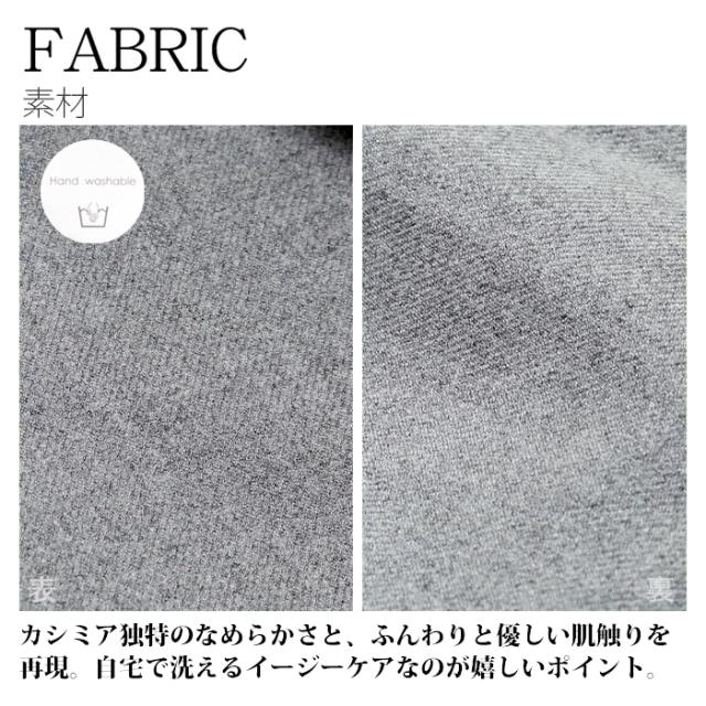 | カシミア独特のなめらかさと、ふんわりと優しい肌触りを再現した上品な生地感。自宅で洗えるイージーケアなのが嬉しいポイントです。 |