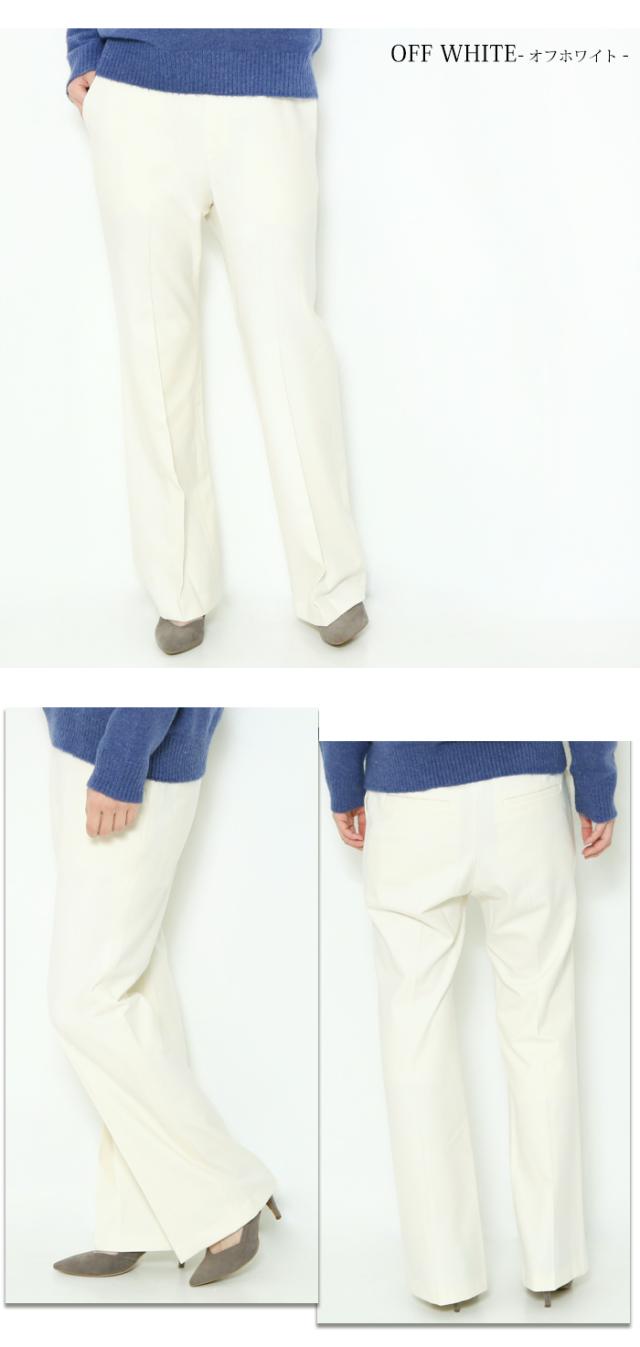 カシミアタッチの優しい穿き心地。美脚見え効果もバツグンのセミフレアパンツ! アクティブなシーンや長距離の座り姿勢にもノンストレスなタテヨコ2WAYストレッチ素材を使用。カシミアタッチの起毛素材は季節感のあるコーデを演出してくれます。 オンオフ対応の万能シルエット。膝下から裾にかけてゆるやかに広がるセミフレアシルエット。キレイ目はもちろん、スウェットやカジュアルなアイテムとも相性抜群。ウエストのフロント部分はベルト状になっており、トップスをインしやすいデザイン。後ろ側はゴム仕様でリラックス感のある穿き心地。ビジネスシーンから休日のおでかけまで、幅広く活躍する上品な大人のセミフレアパンツです。 |
