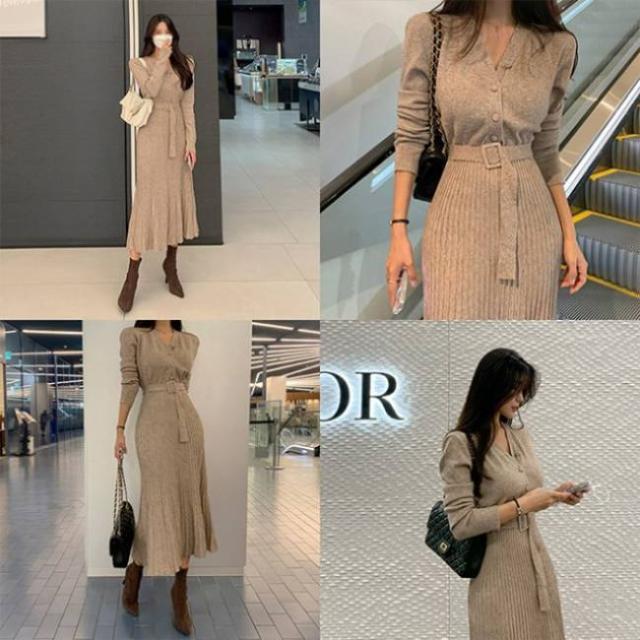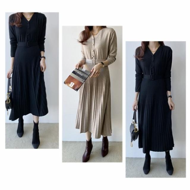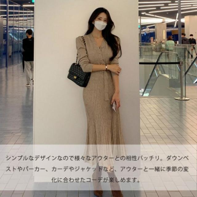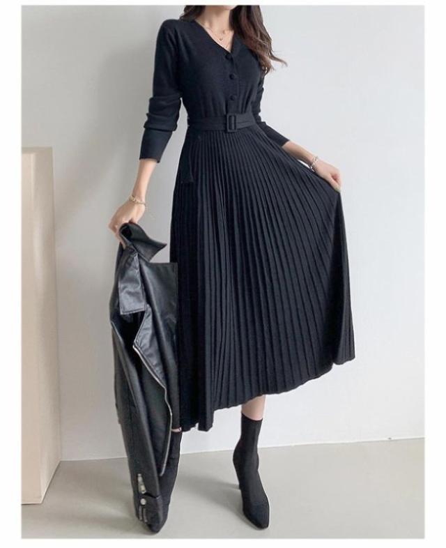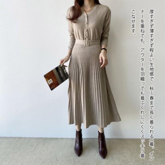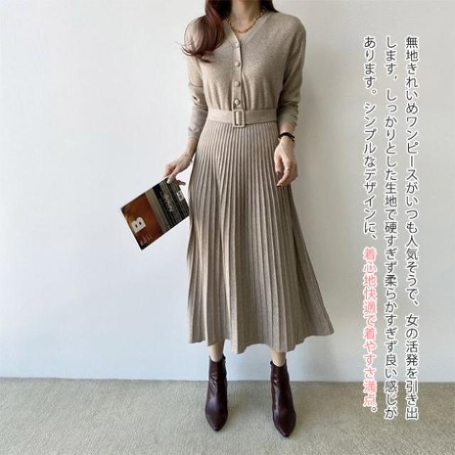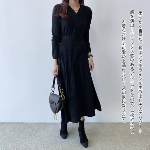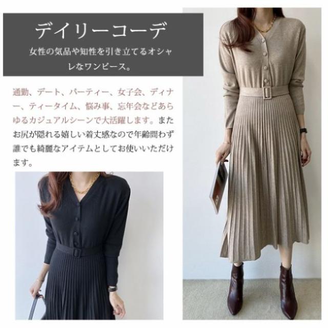 ニットワンピース レディース秋冬きれいめ 上品ワンピース プリーツ模様 ウエストマーク ベルト付き ハイウエスト Aライン Vネック ニット ミモレ丈 着痩せセーターワンピース