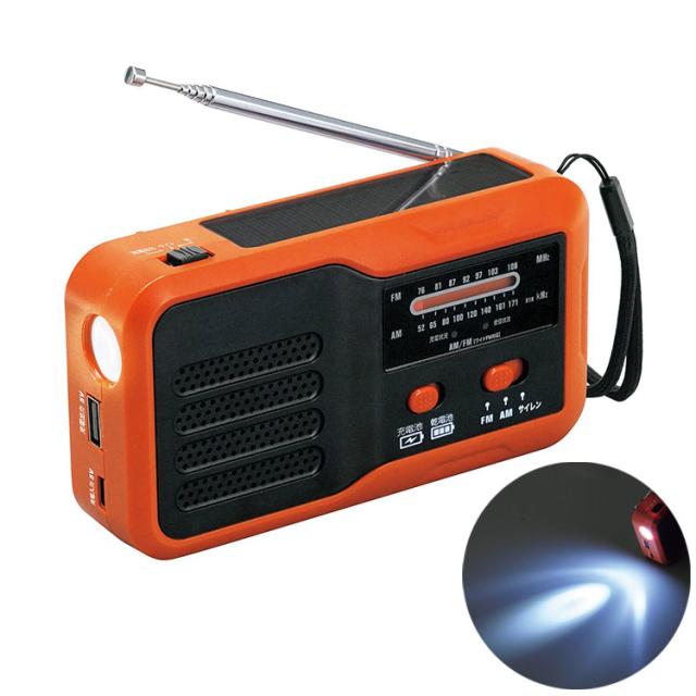 4つの機能:AM/ワイドFM、LEDライト、大音量サイレン、USB給電