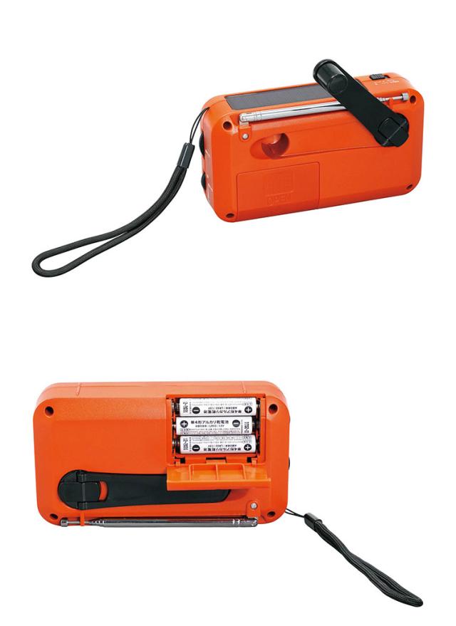 4つの電源:手回し充電、ソーラー充電、乾電池(単4形乾電池×3本使用(別売))、USB充電(入・出力用USBケーブル)