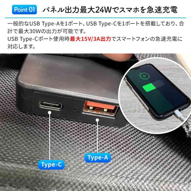 パネル出力最大24Wでスマホを急速充電