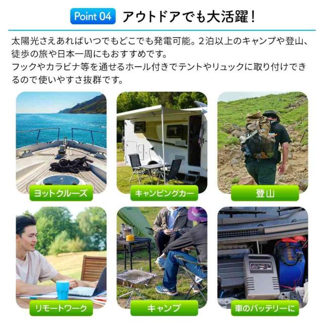 太陽光さえあればいつでもどこでも発電。2泊以上のキャンプや登山、徒歩の旅や日本一周にもおすすめです。