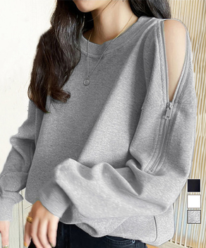 ショルダーファスナーで自由にアレンジができるトレーナーです