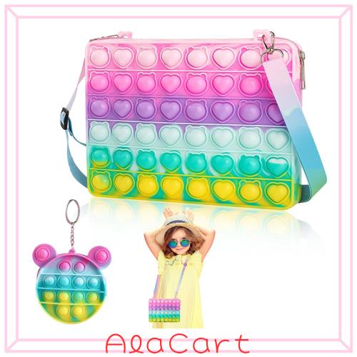【多機能、スクイーズ玩具】:本製品はショルダーバッグとプッシュポップバブルの機能を統一されて、非常に創造なデザインで、子供が好きなカラフルな色合いと可愛い外観で、大人気があります。外出時には、小銭、カギやお菓子などの小物を入れるだけでなく、車の中で退屈な時間を通過させることができ、ハンドバッグは指先感覚玩具として使用することができます。追加のおもちゃをもたらす必要はありません。泡を押すと、わずかな音がします。楽しんでリラックスしてください。