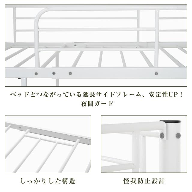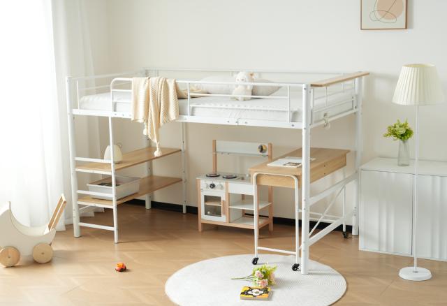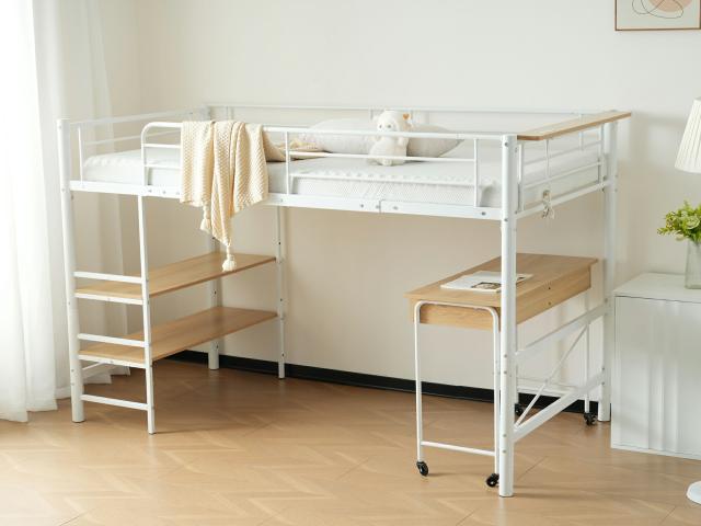 【ベッド下空間】ベッドの下は二段の収納棚と移動可能デスクが設置しています。生活空間や収納スペースとして活用できます。