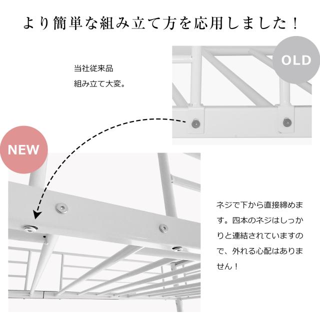 【安全安心】耐荷重150kg。 直径5cmの脚のパイプは、スリムながらもしっかりと支えます。身体を支える床には16のスチール製のバーで支えて、安心感を与えます。