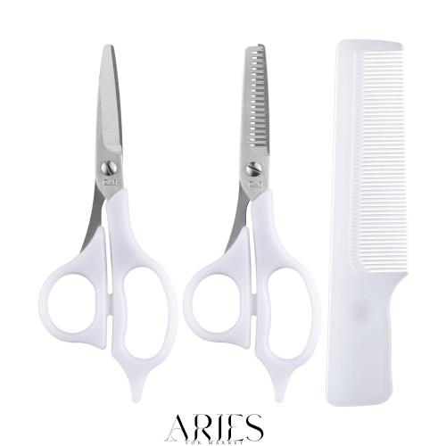長さ調節用のカットハサミ、ボリューム調節用のスキハサミ、クシの3点セット。 美容師監修マニュアル付で初心者にもわかりやすい。