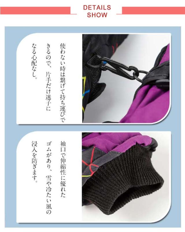 | 機能性だけでなく快適な着心地も実現キッズグローブ 水の浸透に強い撥水性・耐水性に優れた素材。 マジックテープ付き仕様、寒さ対策もバッチリ!お好みで調整可能!手首を優しくフィットし、快適な付け心地を実現する! 袖口で伸縮性に優れたゴムがあり、雪や冷たい風の浸入を防ぎます。 使わない時は繋げて持ち運びできるので、片手だけ迷子になる心配なし。 | |