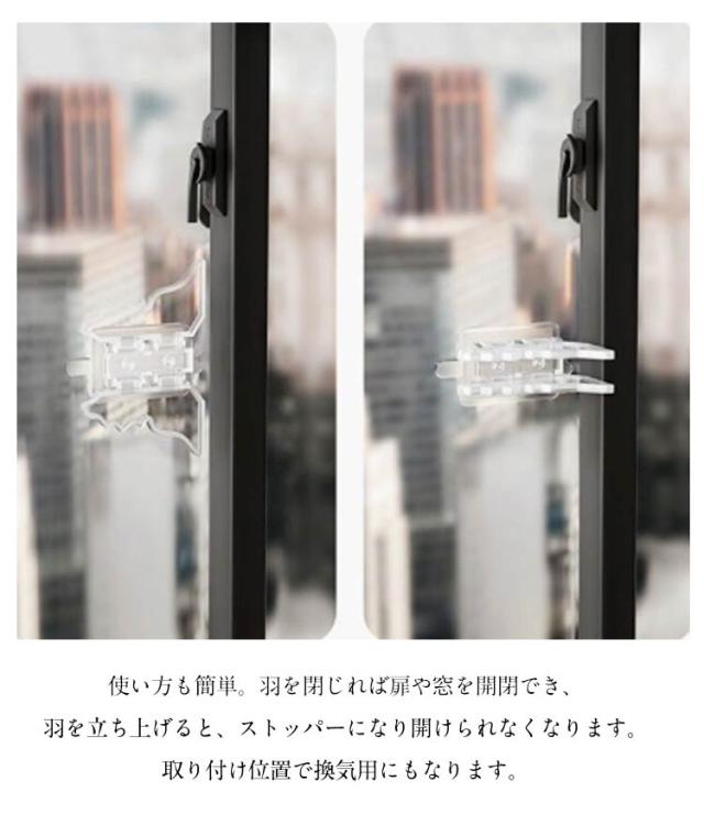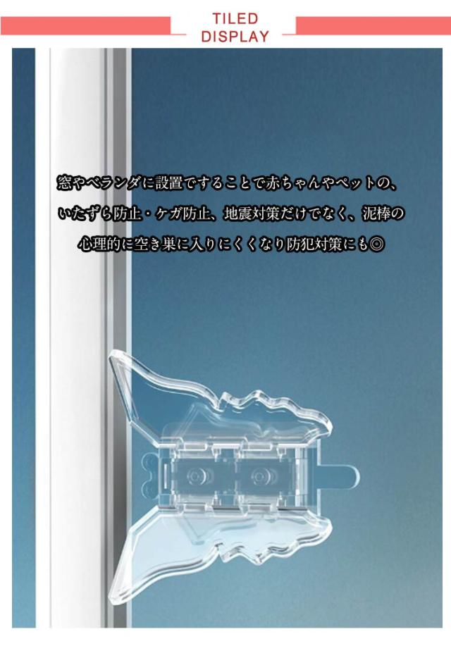 | 貼るだけで事故・いたずら防止!安全ロック15個セット テープ式で簡単につけられます♪ 好奇心旺盛なキッズのいたずら防止、けが防止に。ペットの脱走防止に。棚に設置すれば、地震で中の物が飛び出しにくくになり、防災グッズにもなります。 ネジやドライバーも不要なので、おうちの中の窓ガラスやベランダの掃き出し窓、室内の引き戸等、色々なところにテープ式で簡単に取り付けられます。 使い方も簡単。羽を閉じれば扉や窓を開閉でき、羽を立ち上げると、ストッパーになり開けられなくなります。取り付け位置で換気用にもなります。 窓やベランダに設置ですることで赤ちゃんやペットの、いたずら防止・ケガ防止、地震対策だけでなく、泥棒の心理的に空き巣に入りにくくなり防犯対策にも◎ | |