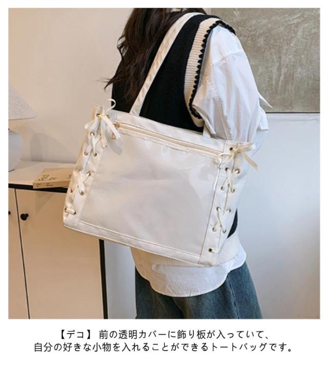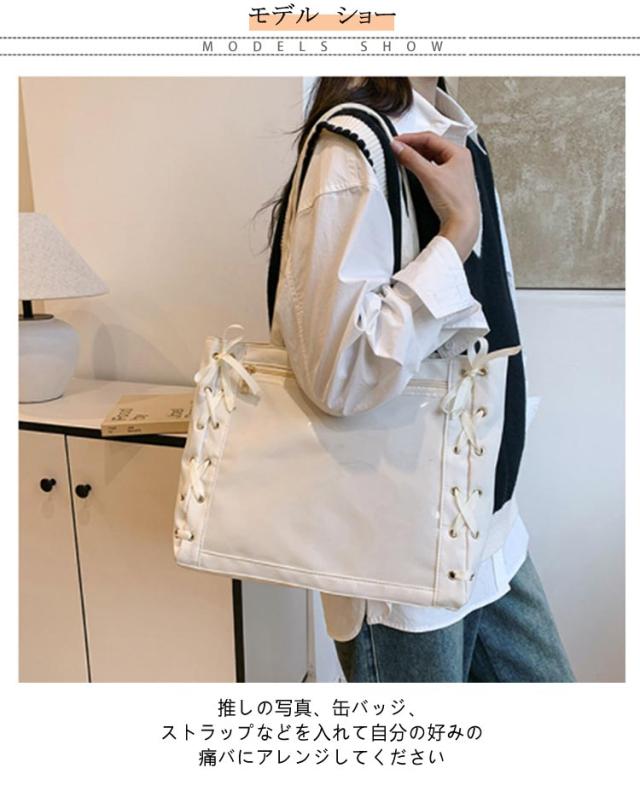 | ☆ レースアップのデザインが可愛いトートタイプの痛バックです! 推しの写真、缶バッジ、ストラップなどを入れて自分の好みの痛バにアレンジしてください♪ 【デコ】 前の透明カバーに飾り板が入っていて、自分の好きな小物を入れることができるトートバッグです。 好きな芸能人や、アニメの写真 、缶バッジ、ストラップ、ぬいぐるみ、キーホルダーなどを入れるだけで、 簡単に世界で1つたったのオリジナルバッグの完成です。 【A4大容量】内部4個ポケットがあり、仕切りがあり、分割収納できます。見た目以上の収納力、 しっかり収納できる。A4雑誌、ipad、教科書、手帳、ファイル、スマホ、傘、化粧品、財布などを入れます。 | |