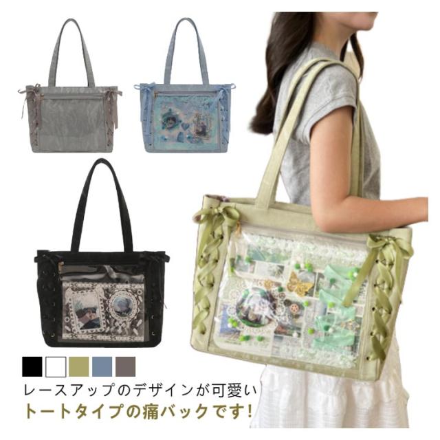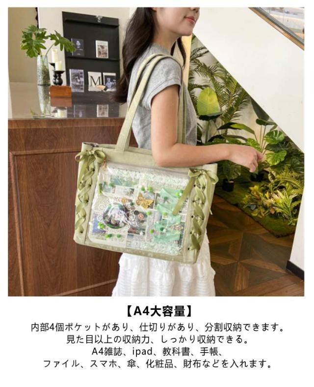 | ☆ レースアップのデザインが可愛いトートタイプの痛バックです! 推しの写真、缶バッジ、ストラップなどを入れて自分の好みの痛バにアレンジしてください♪ 【デコ】 前の透明カバーに飾り板が入っていて、自分の好きな小物を入れることができるトートバッグです。 好きな芸能人や、アニメの写真 、缶バッジ、ストラップ、ぬいぐるみ、キーホルダーなどを入れるだけで、 簡単に世界で1つたったのオリジナルバッグの完成です。 【A4大容量】内部4個ポケットがあり、仕切りがあり、分割収納できます。見た目以上の収納力、 しっかり収納できる。A4雑誌、ipad、教科書、手帳、ファイル、スマホ、傘、化粧品、財布などを入れます。 | |