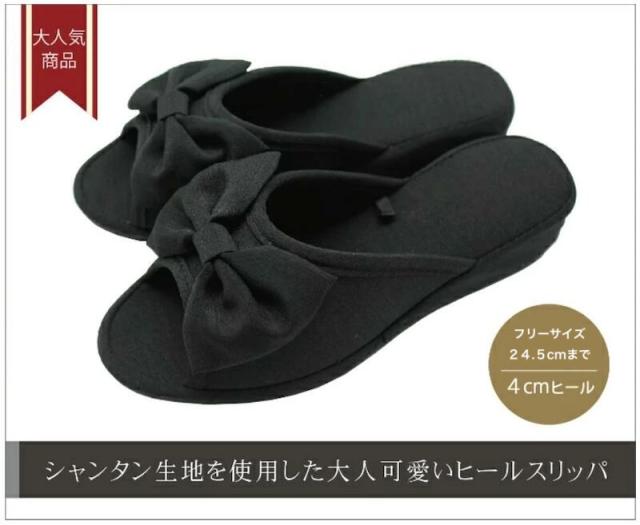 【袋なし】シャンタン素材 リボン ヒール スリッパ 黒 ルームシューズ オフィス
