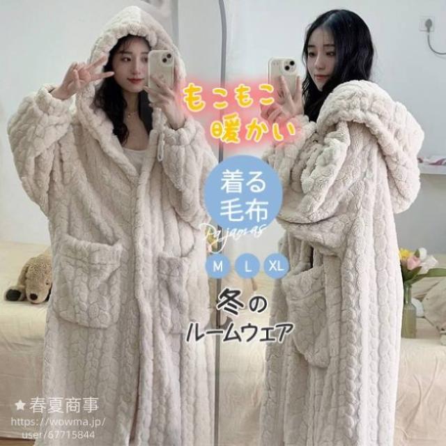 新作 ルームウェア レディース 着る毛布 ガウン ネグリジェ もこもこ パジャマ フード付き 長袖 ロング 部屋着 前開き 暖かい 冷え対策 防寒 保温 大きいサイズ 春秋冬