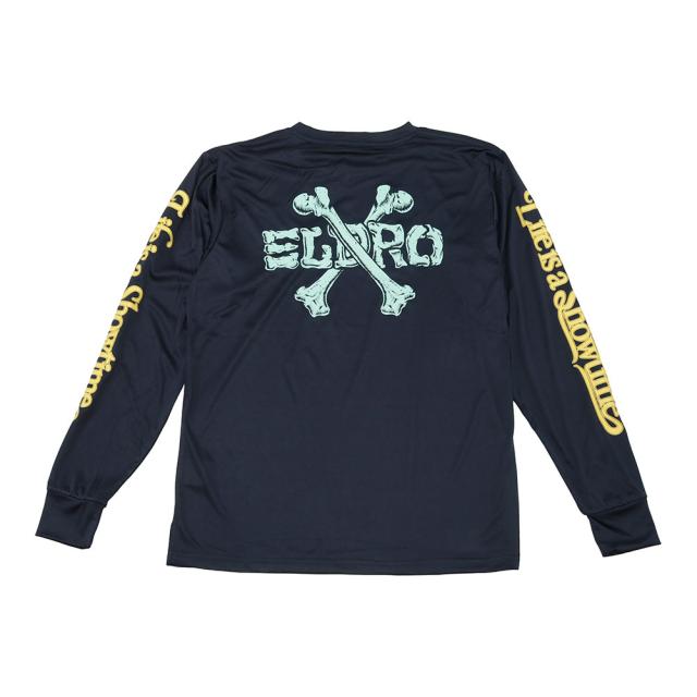 エルドレッソが得意とするクロスボーンモチーフを背中に、かの有名な90年代のヒットチューンからピックアップしたポジティブなワードを両袖にプリントしたロングスリーブTシャツです。エルドレッソでは幾種もの機能素材をデザイナー自ら実践でのテストを重ね、商品に採用する生地を選定。こちらの商品にはUVカット効果を持つシルキータッチな機能素材をセレクトしており、着心地良好な仕上がりとなっています。ボディはベーシックなロンTの型がベースとなっており、ランニングシャツとしてのみならず、タウンユースでも着こなしやすいサイジングも魅力です。