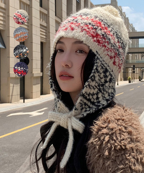 ニット帽子 レディース 配色 紐付き 送料無料 即日発送