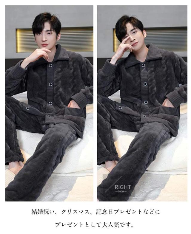 裏起毛 長袖 室内用 冬用 防寒 メンズ 暖かい 上下セット もこもこ 裏起毛 パジャマ セットアップ 寝巻き 部屋着 あったか 着る毛布 前開き 暖かい 無地 厚手 紳士 男性 ギフト