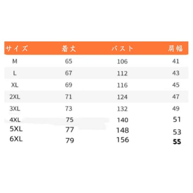 | サイズについての説明 | M 着丈(65cm) バスト(106cm) 肩幅(41cm) 体重参考(52.5kgまで) L 着丈(67cm) バスト(112cm) 肩幅(43cm) 体重参考(65kgまで) XL 着丈(69cm) バスト(116cm) 肩幅(45cm) 体重参考(75kgまで) 2XL 着丈(71cm) バスト(124cm) 肩幅(47cm) 体重参考(85kgまで) 3XL 着丈(73cm) バスト(132cm) 肩幅(49cm) 体重参考(95kgまで) 4XL 着丈(75cm) バスト(140cm) 肩幅(51cm) 体重参考(100kgまで) 5XL 着丈(77cm) バスト(148cm) 肩幅(53cm) 体重参考(110kgまで) 6XL 着丈(79cm) バスト(156cm) 肩幅(55cm) 体重参考(115kgまで) ※測定方法によって誤差が生じますので、予めご了承下さい。 |
