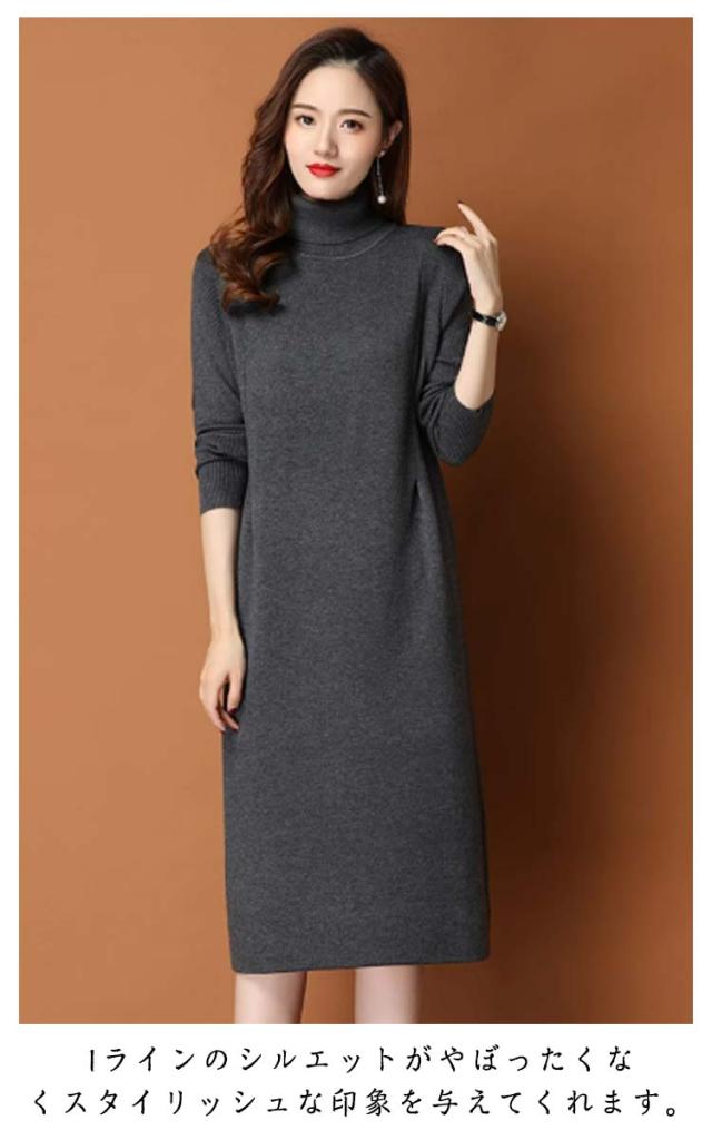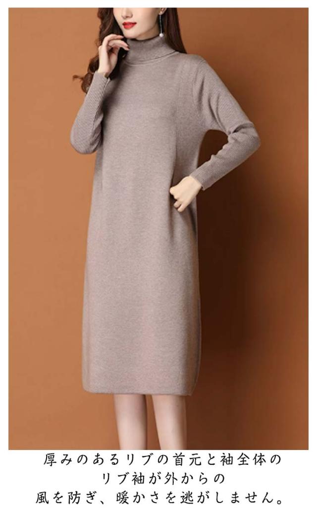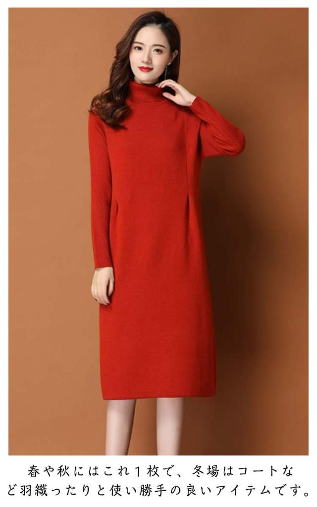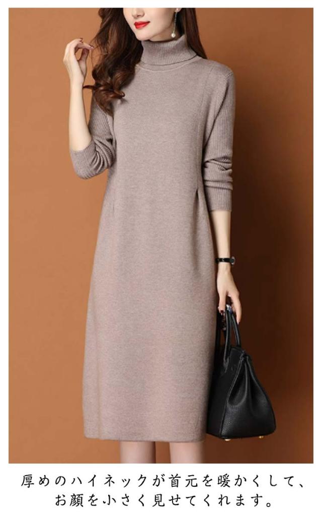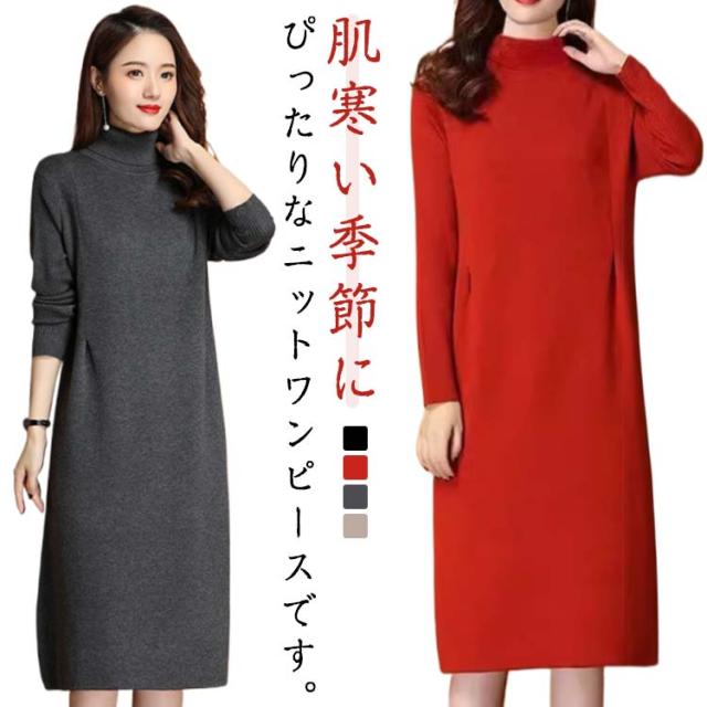 リブニット 無地 膝丈 ハイネック ニットワンピース ハイネック レディース ひざ下丈 チュニック 秋冬 ニット ワンピース インナー 長袖 ロングワンピース 無地 体型カバー オシャレ