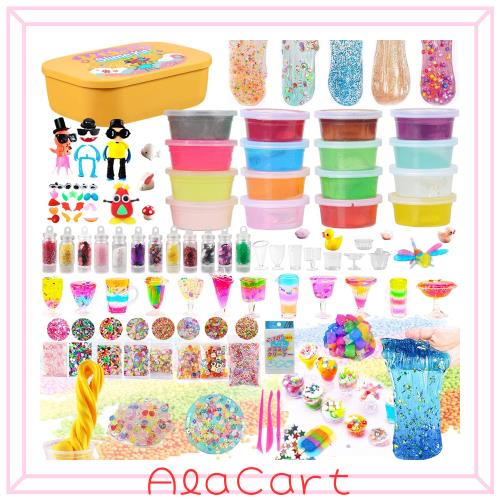 バリエーション豊かなスライムキットです!さまざまな色のスライムに、91個の異なる付属品の、キラキラクリスタルスライム、 フルーツスライム、カリカリスライム、発泡スチロールスライムなど、いろいろなバリエーションを自分で創造し、指先でこねたり、形をつくってみたりと、知育になります!子供の集中力も、とてもつきました。