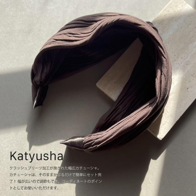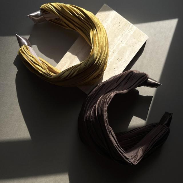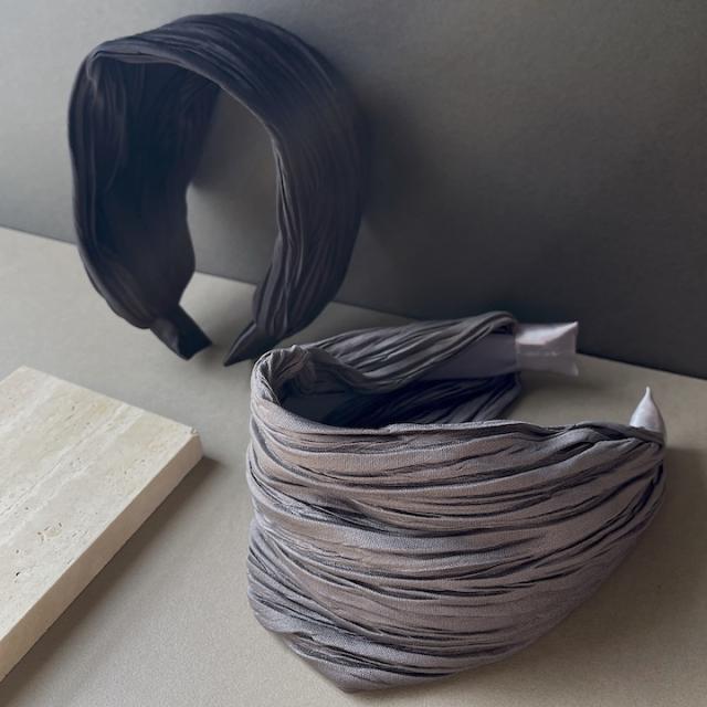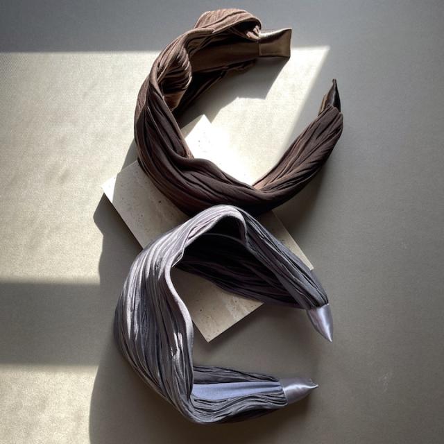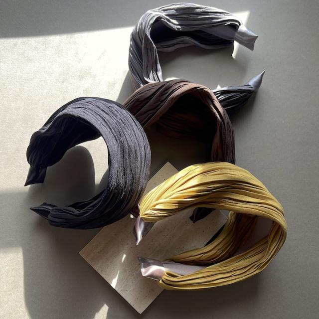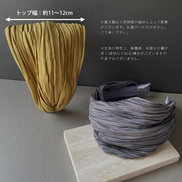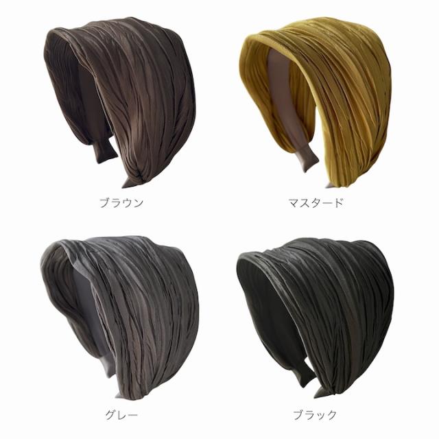 クラッシュプリーツ加工が施された幅広カチューシャ。カチューシャは、そのままかぶるだけで簡単にセット完了!
