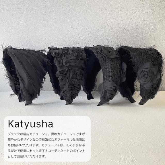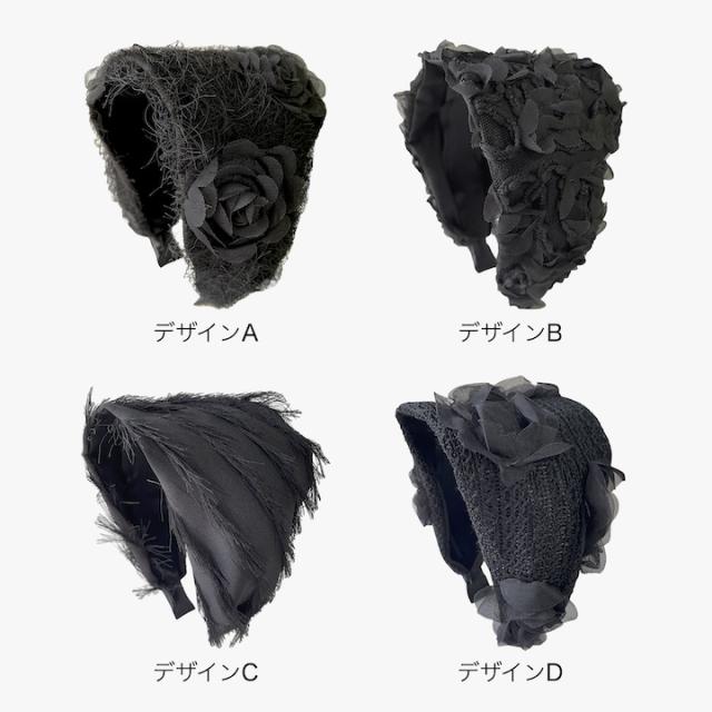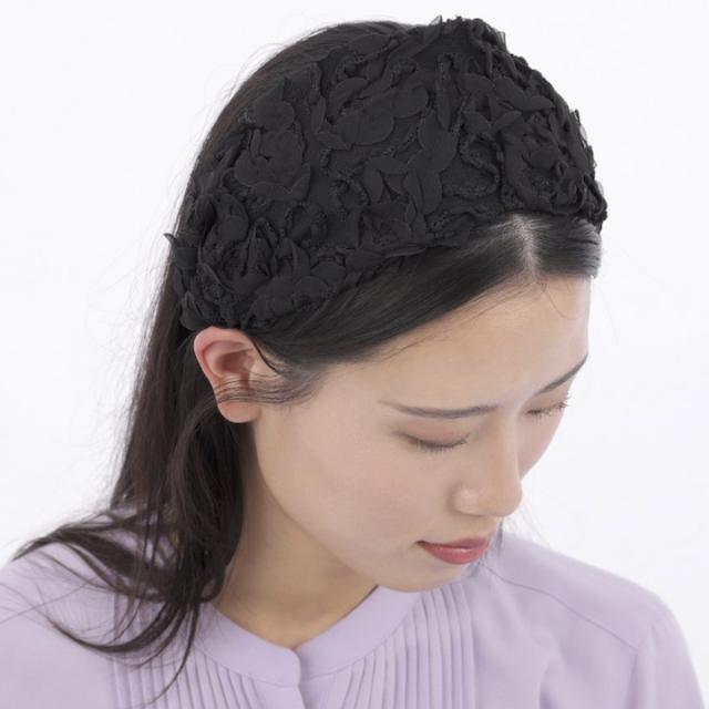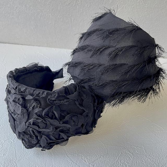 ブラックの幅広カチューシャ。黒のカチューシャですが華やかなデザインなので結婚式などフォーマルな場面にもお使いいただけます。