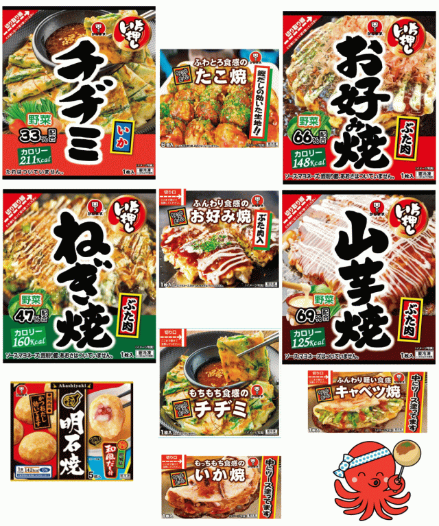 ●いち押しシリーズは、お好み焼 ぶた玉、山芋焼、ねぎ焼、チヂミの4種入ります。