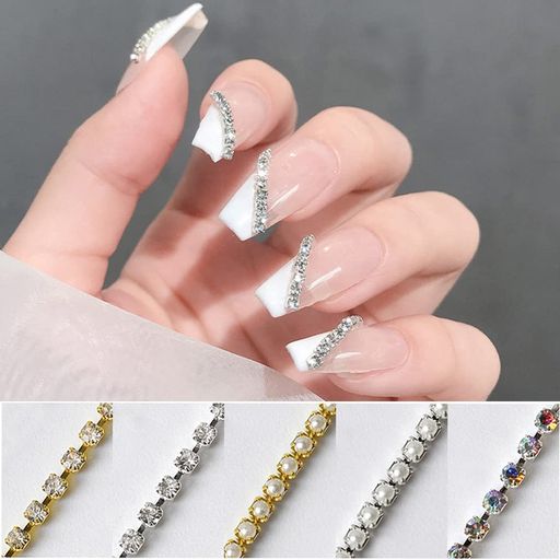 【きらきら】:ラインストーンはネイルチェーンの中心にはめ込まれて、ダイアモンドのように切断面を持ち、ご指先をキラキラと輝いています。